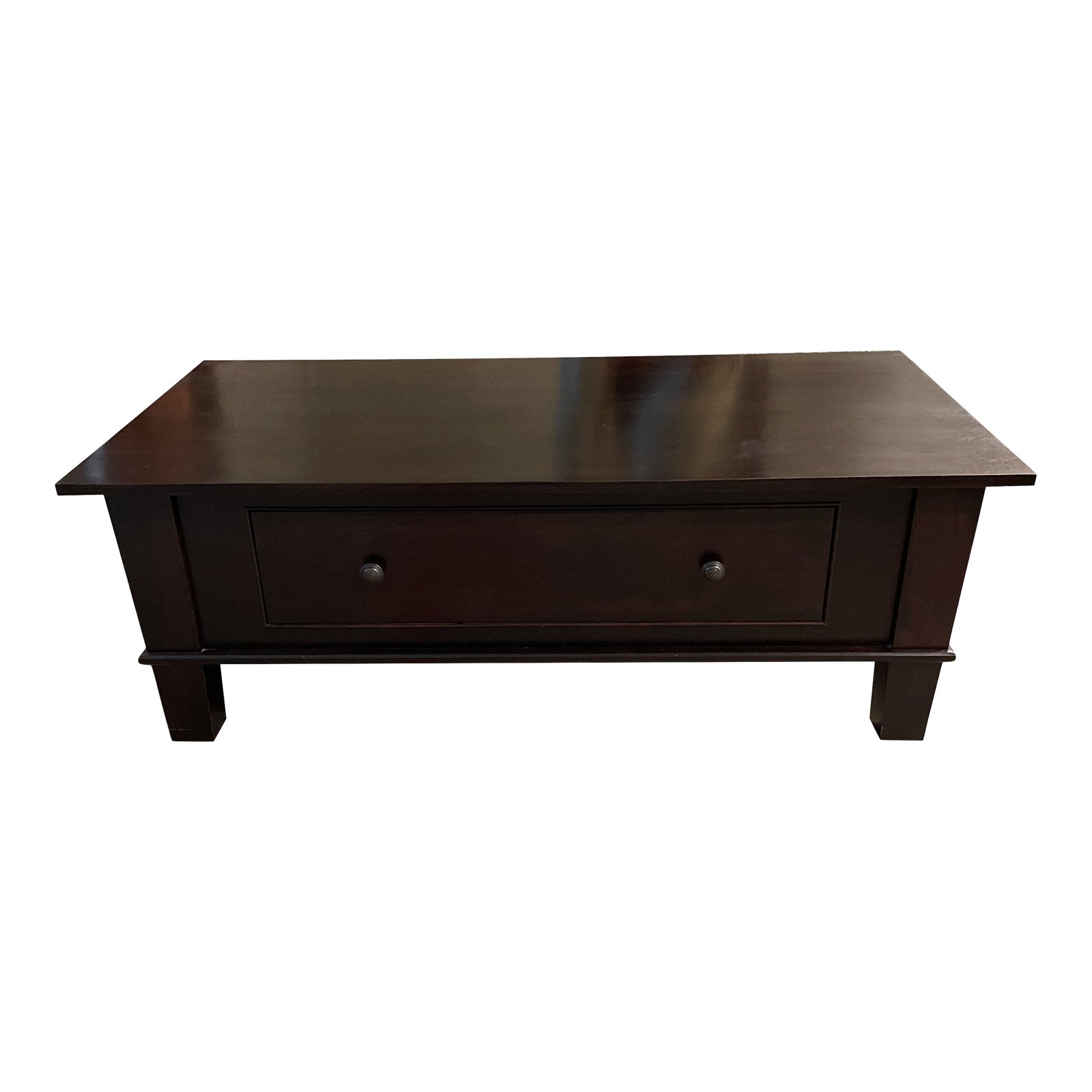 Design Plus Gallery presents a Coffee Table by Restoration Hardware. A rectangular shape with block legs. Consist of one pullout drawer. The wood frame is in a dark espresso finish. Viable and minor wear from usage and age.