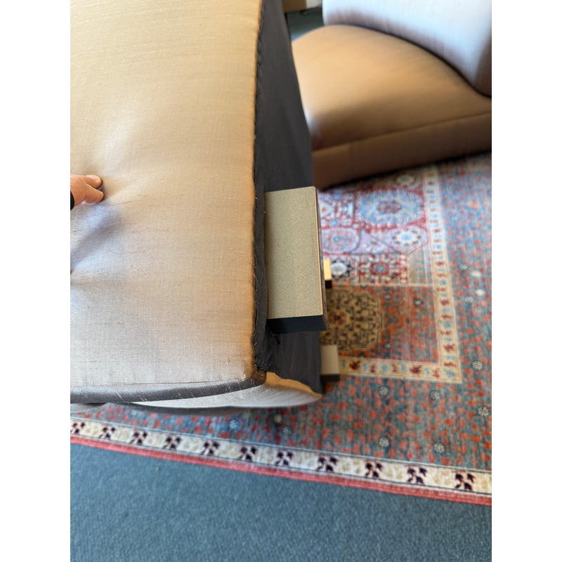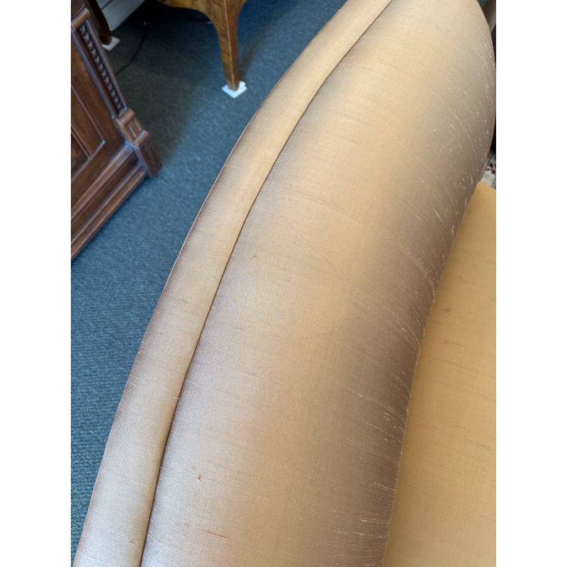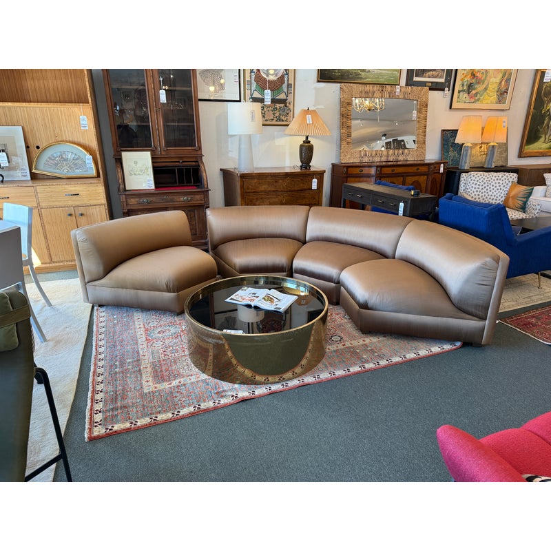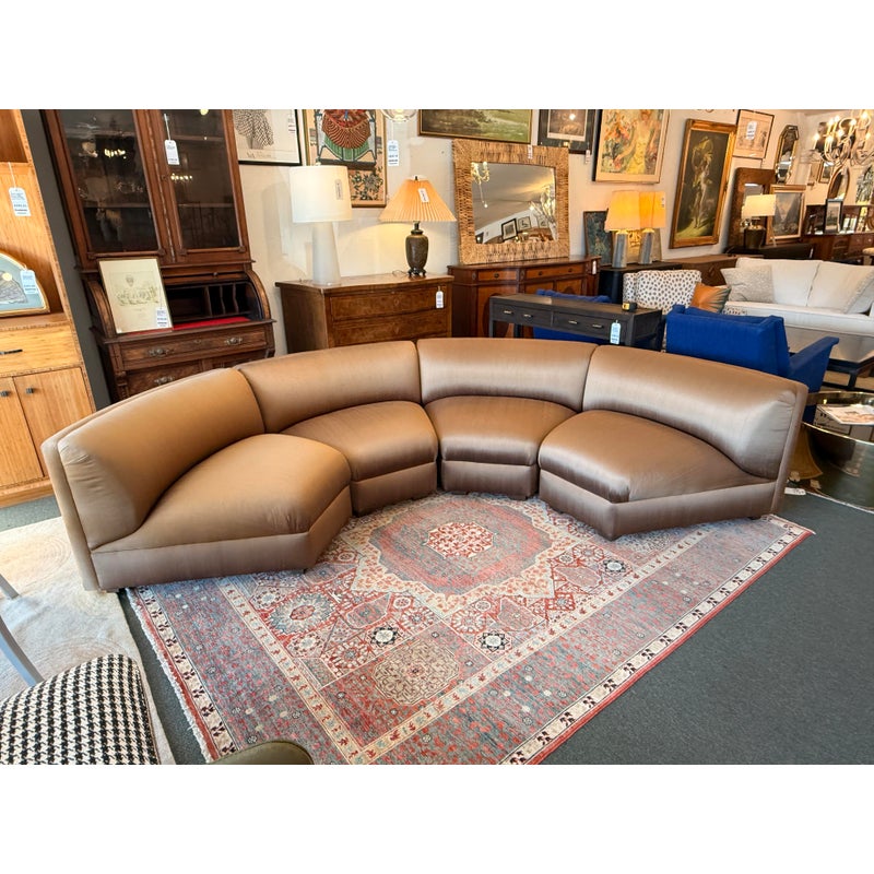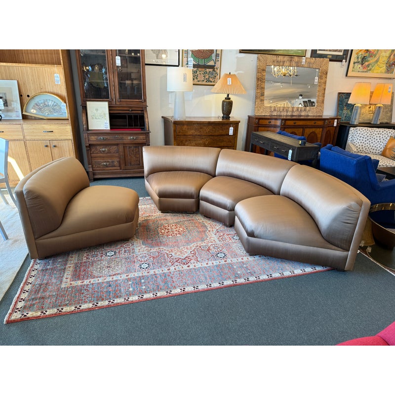 Design Plus Gallery presents a Silk Serpentine Sectional of Four Pieces from Richard Andronaco. A curved sofa is always a luxury to have as it takes on a sophisticated flow for any everyday setting. We love its sinuous angles and supple textile of silk blend in a gleaming bronze tone. There are four segments of equal proportions that join together for a quarter circle. The sectional is in good overall condition for its usage. Made in the USA.