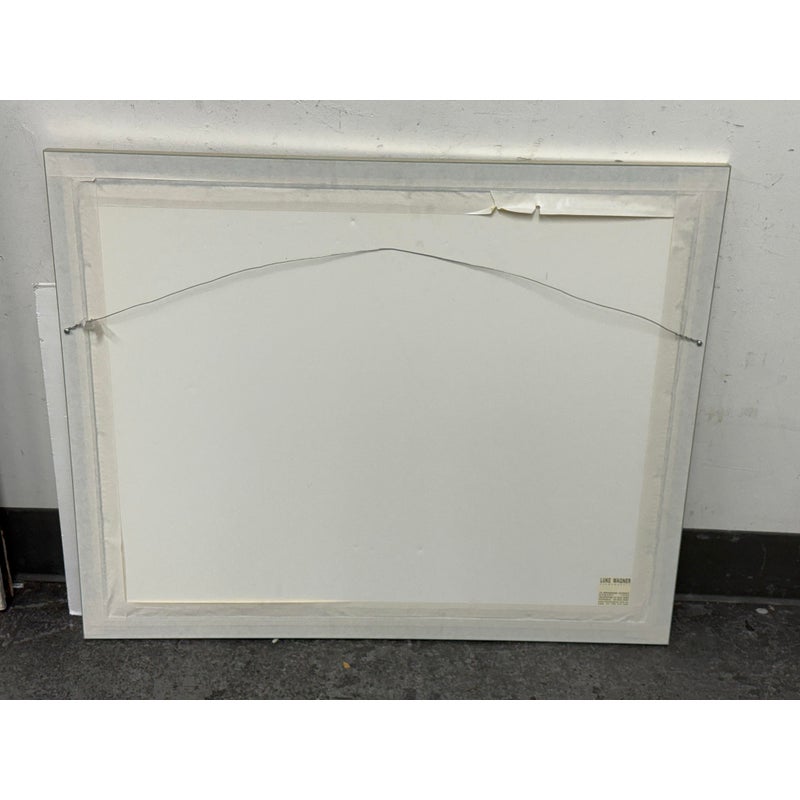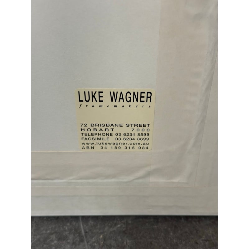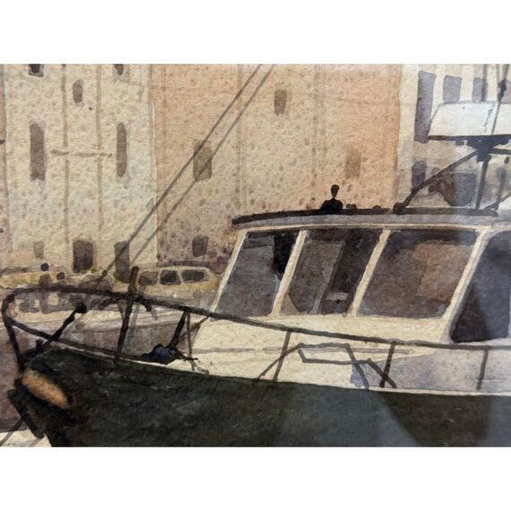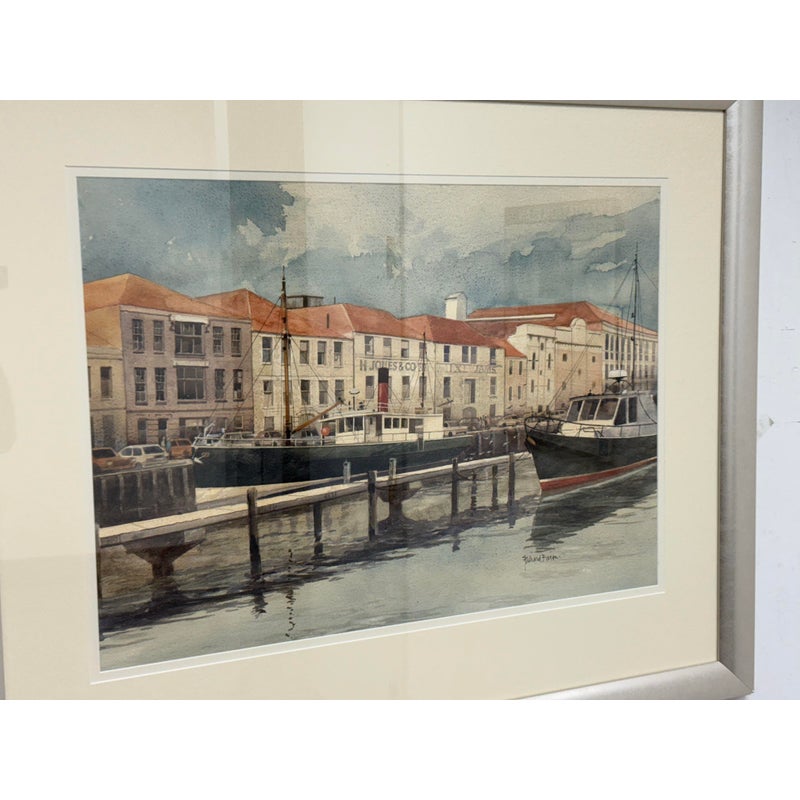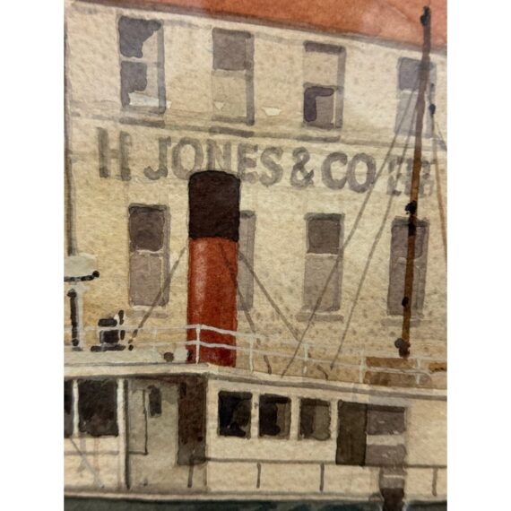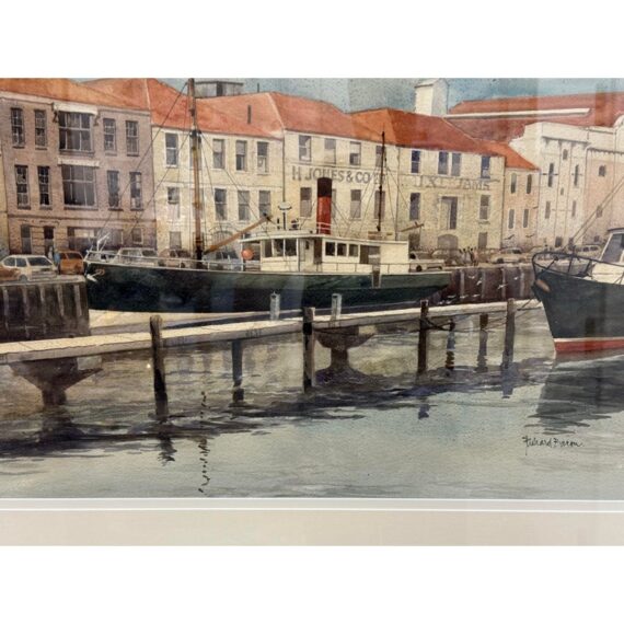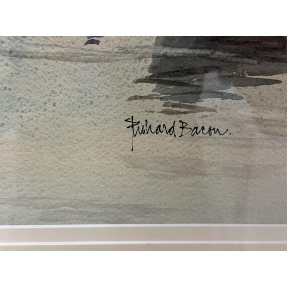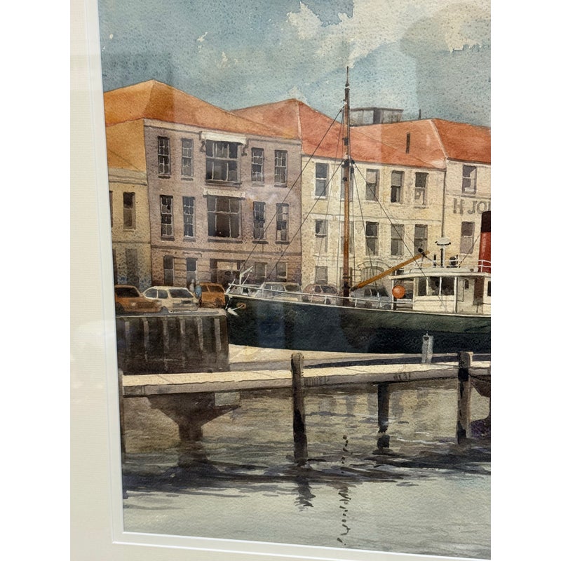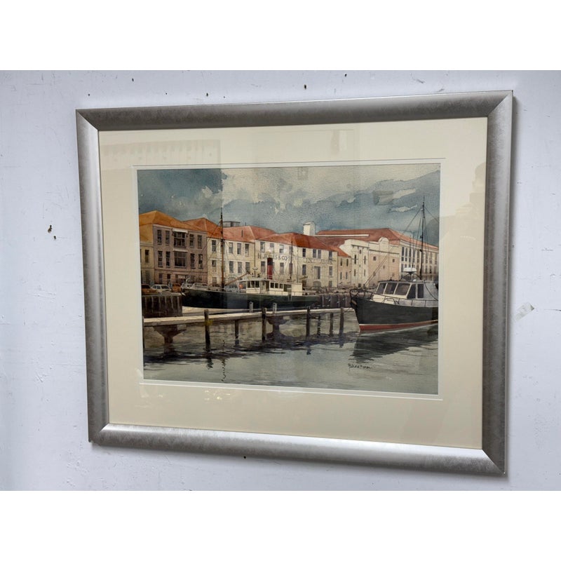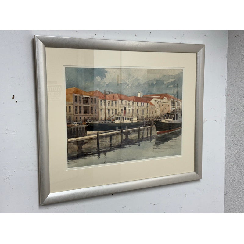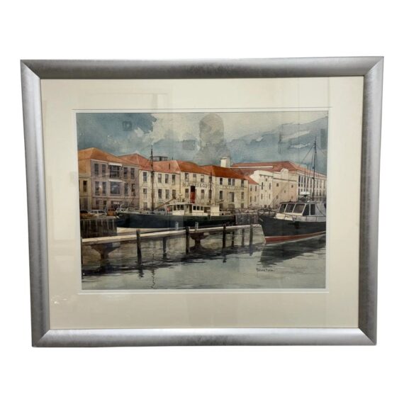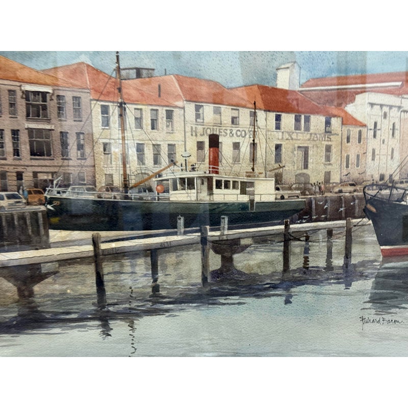 Design Plus Gallery presents a Maritime Watercolor Painting by Richard Bacon, Signed on Lower Right Side. A notable building if present in the background of H Jones & Co. a Jam producer in Melbourne Australia. The artwork shows a single dock with numerous boats stilly floating with the cities waterfront buildings all having similar characteristics of off white structure and red roofs. There is minimal wear to the frame + artwork, considered to be in good condition for its usage.