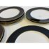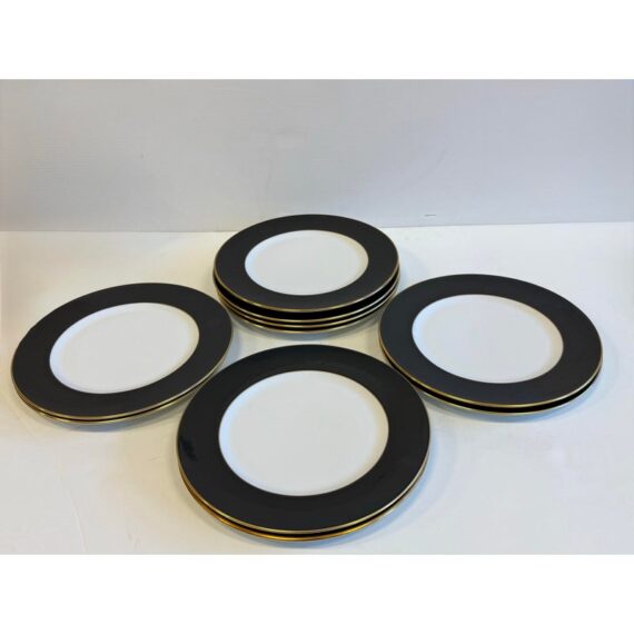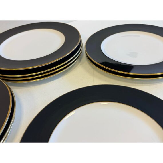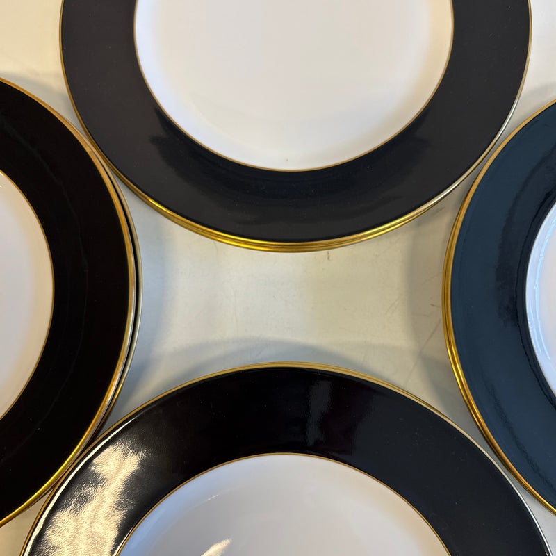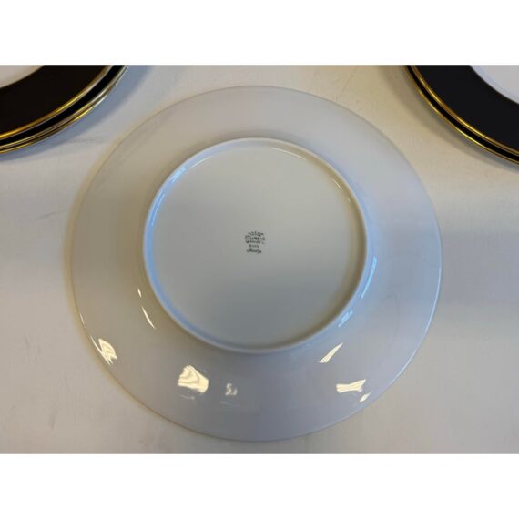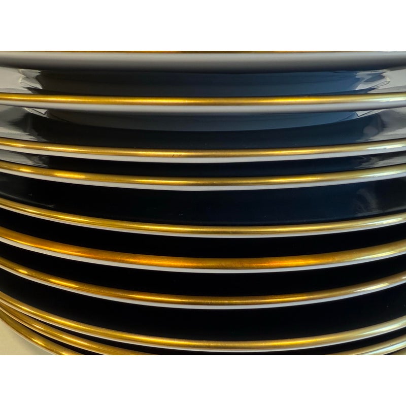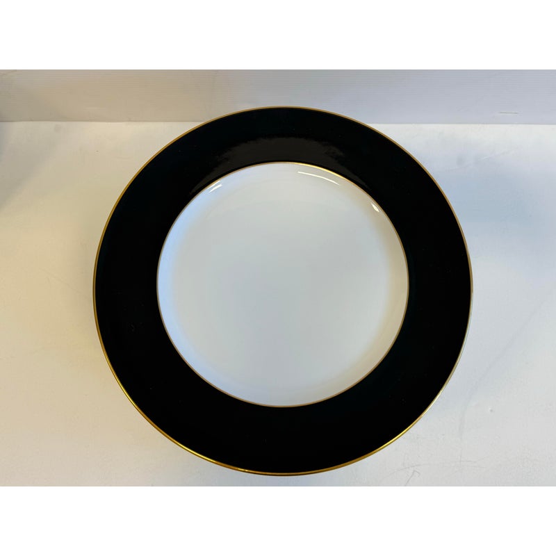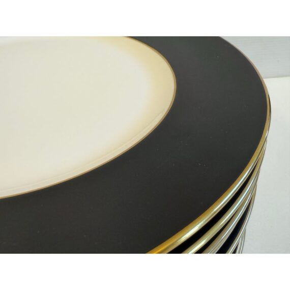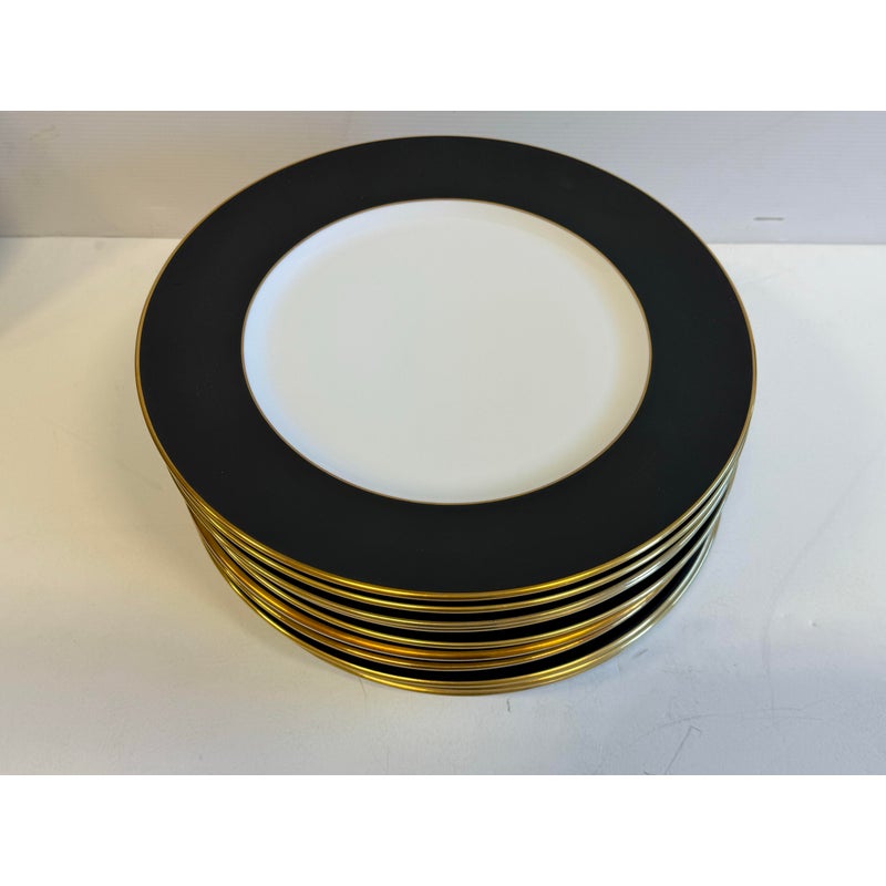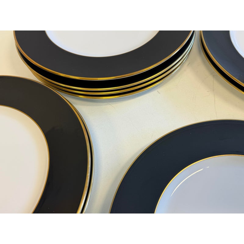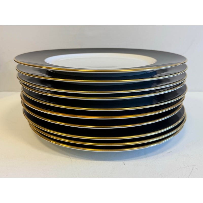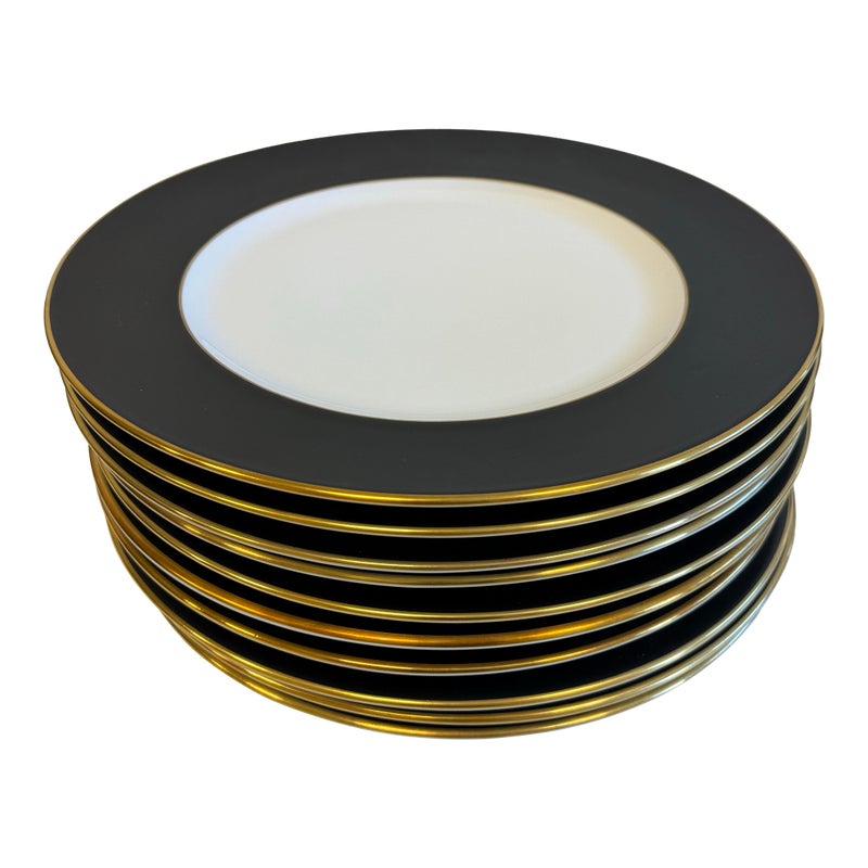Design Plus Gallery presents a Set of Ten Service Plates in Black with Gold Trim by Richard Ginori. These handpainted charger/service plates are fine porcelain from Ginori and make beautiful foundations for any tablescape in any season. Handmade in Italy. They are all in good condition with minimal wear for their age + use.