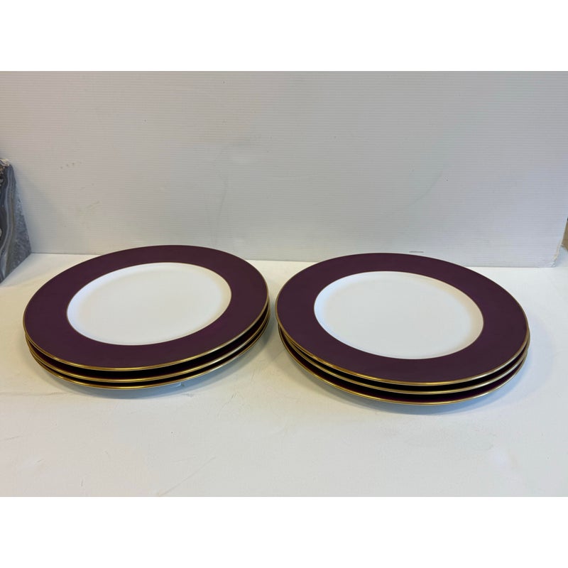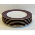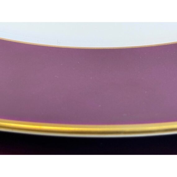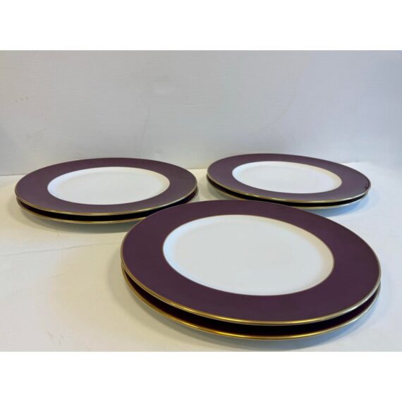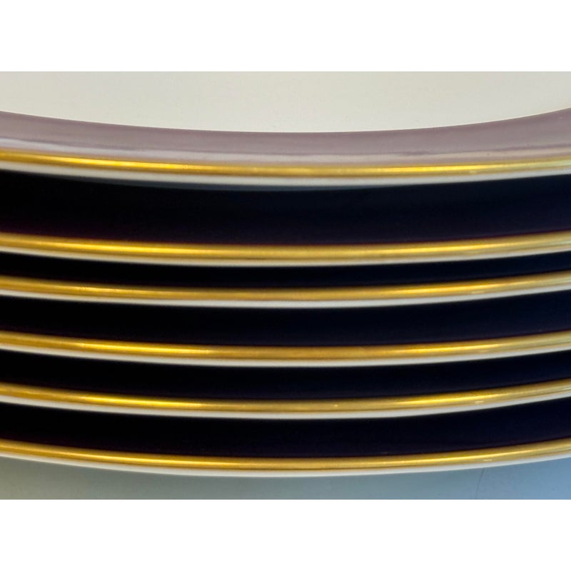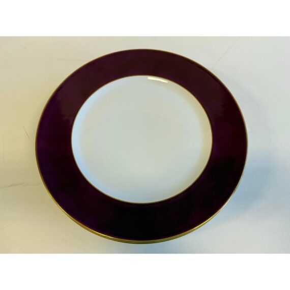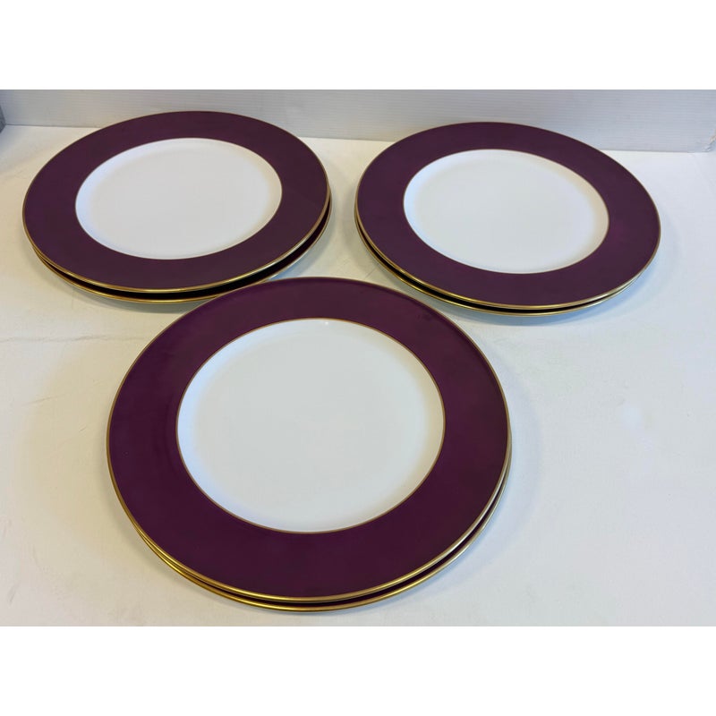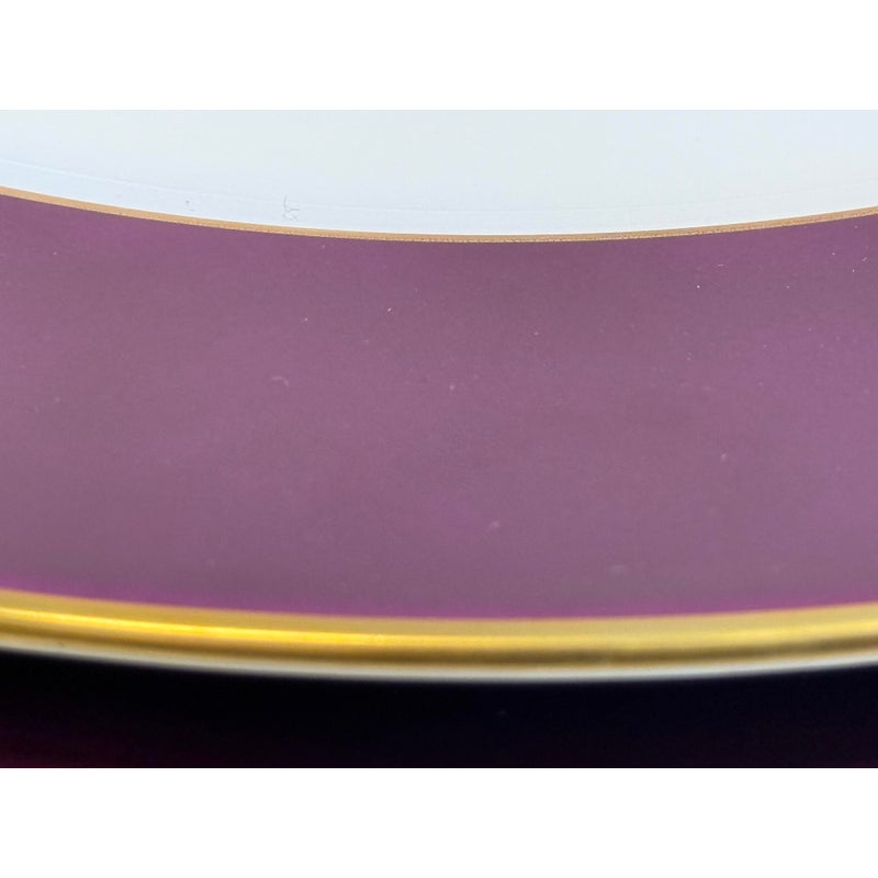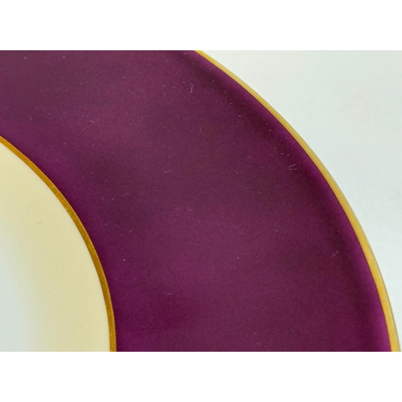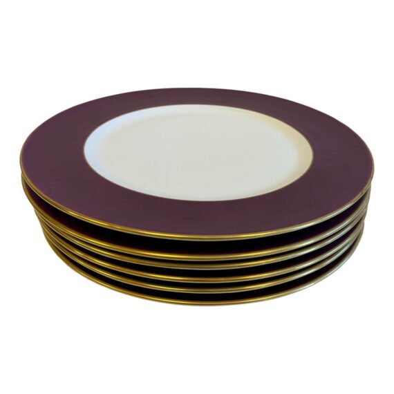 Design Plus Gallery presents a Set of Six Service Plates in Burgundy with Gold Trim by Richard Ginori. These handpainted charger/service plates are fine porcelain from Ginori and make beautiful foundations for any tablescape in any season. Handmade in Italy. They are all in good condition with minimal wear for their age + use.