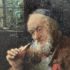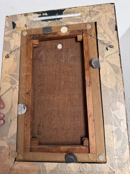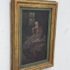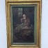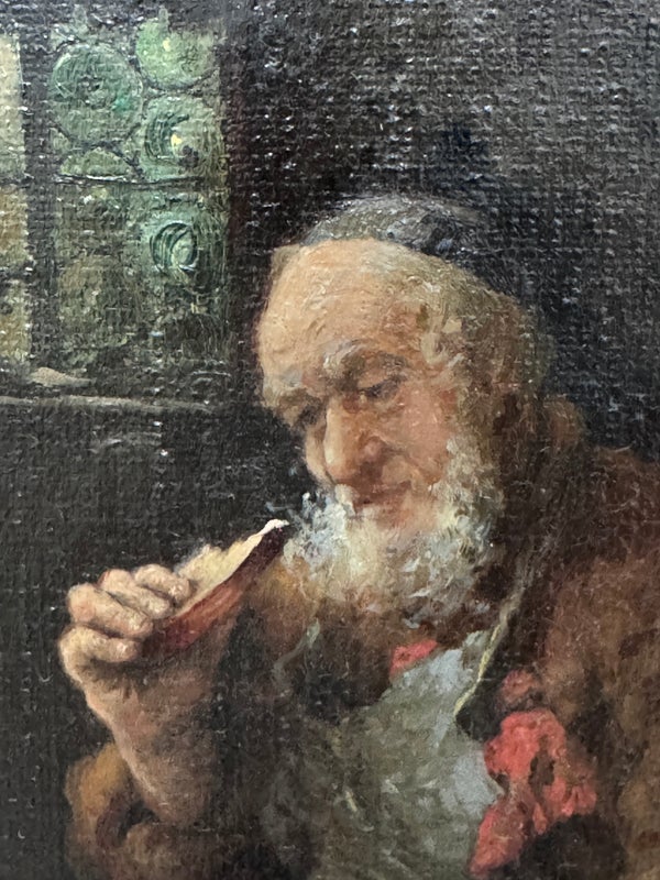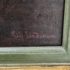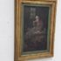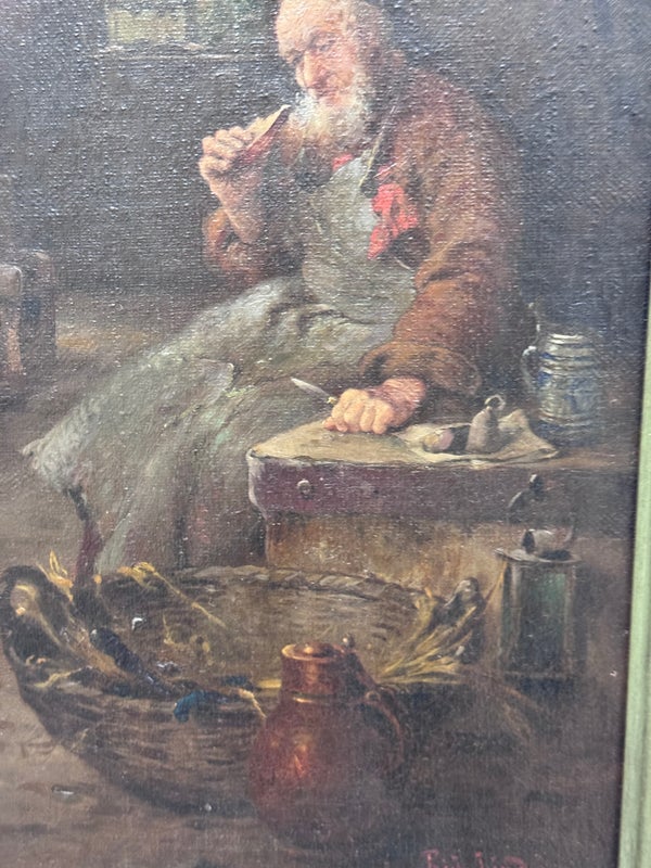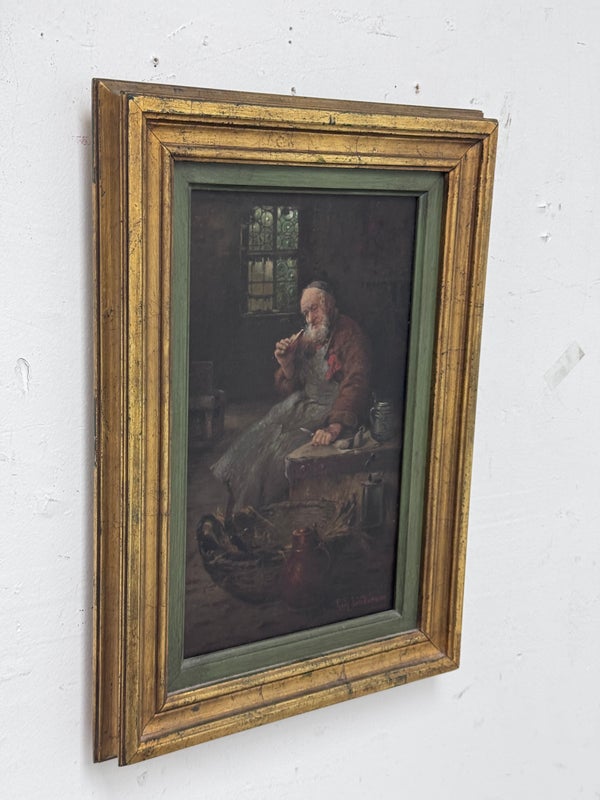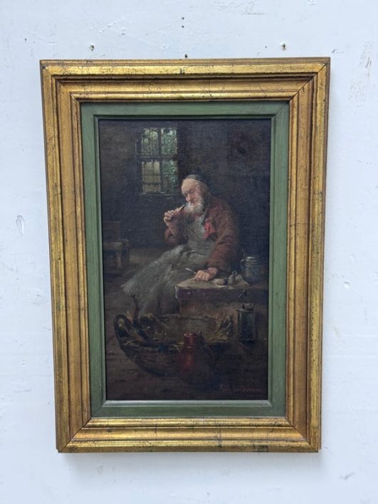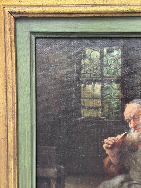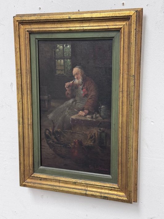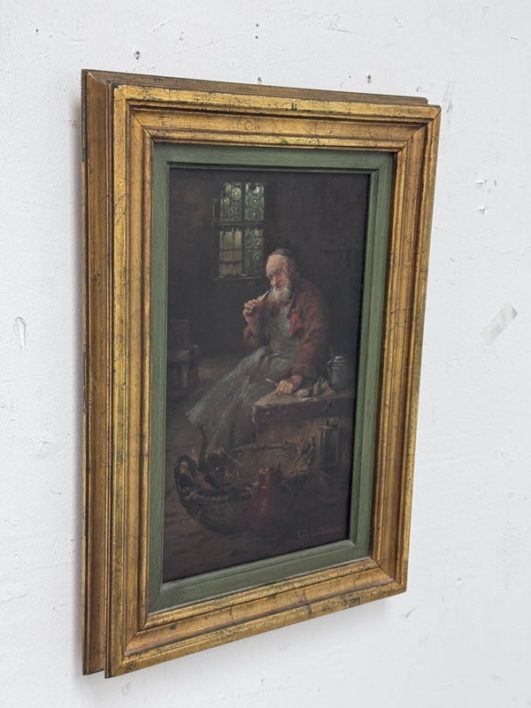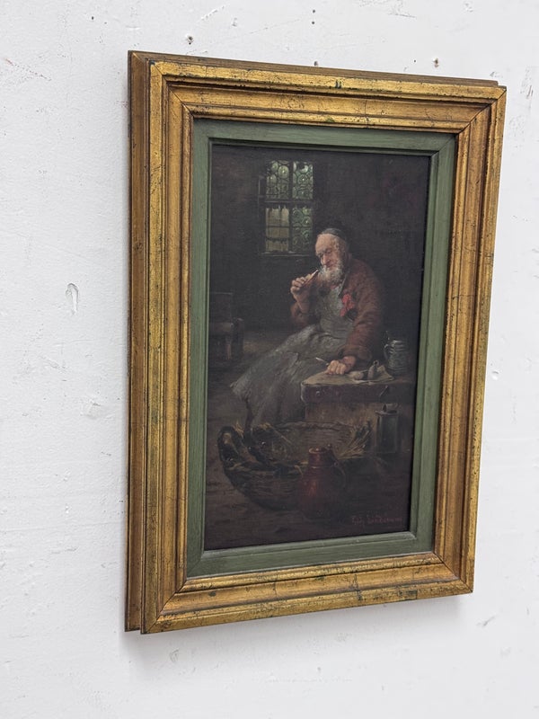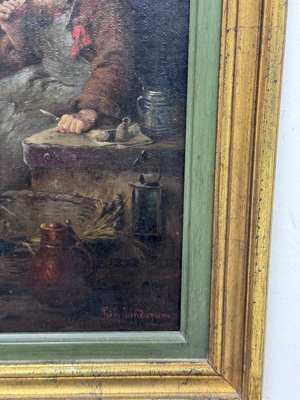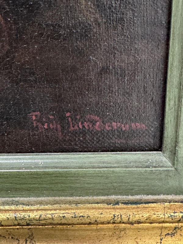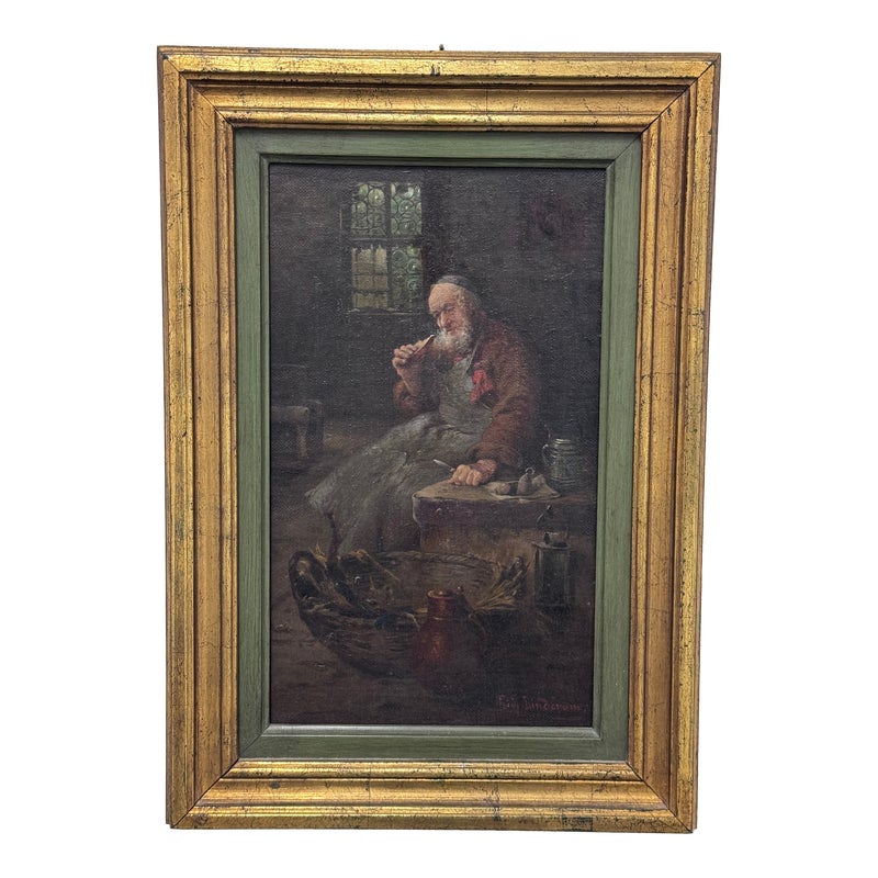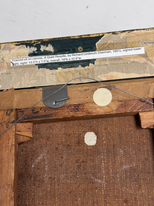 Design Plus Gallery presents an Original Artwork by Richard Linderum (German, 1851-1926). “A Quiet Respite,” oil on canvas that the artist has signed on the lower right. Darkened canvas, sage green matte, with girl wood double bevel edge also original frame. In good condition for its antique age + use with some visible wear.