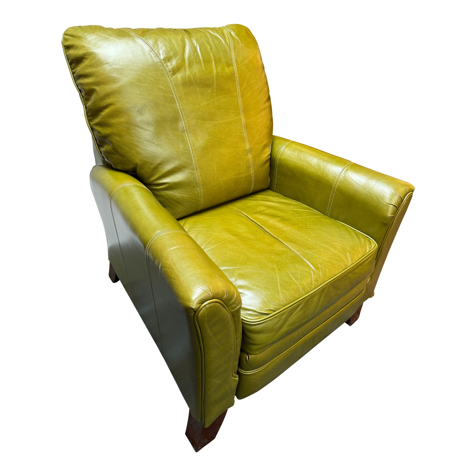 Design Plus Gallery presents the Riley Recliner by Lazy Boy. A perfect mix of classic details such as subtle rolled arms, welt trim and lush “Mahogany” leather with simple block legs and simple silhouette. Deep box border seats and higher back provide plenty of space to sit and relax with just the right amount of comfort from blown fiber fill and foam cushions. Manual recliner. Light surface wear; condition is good for age and use.