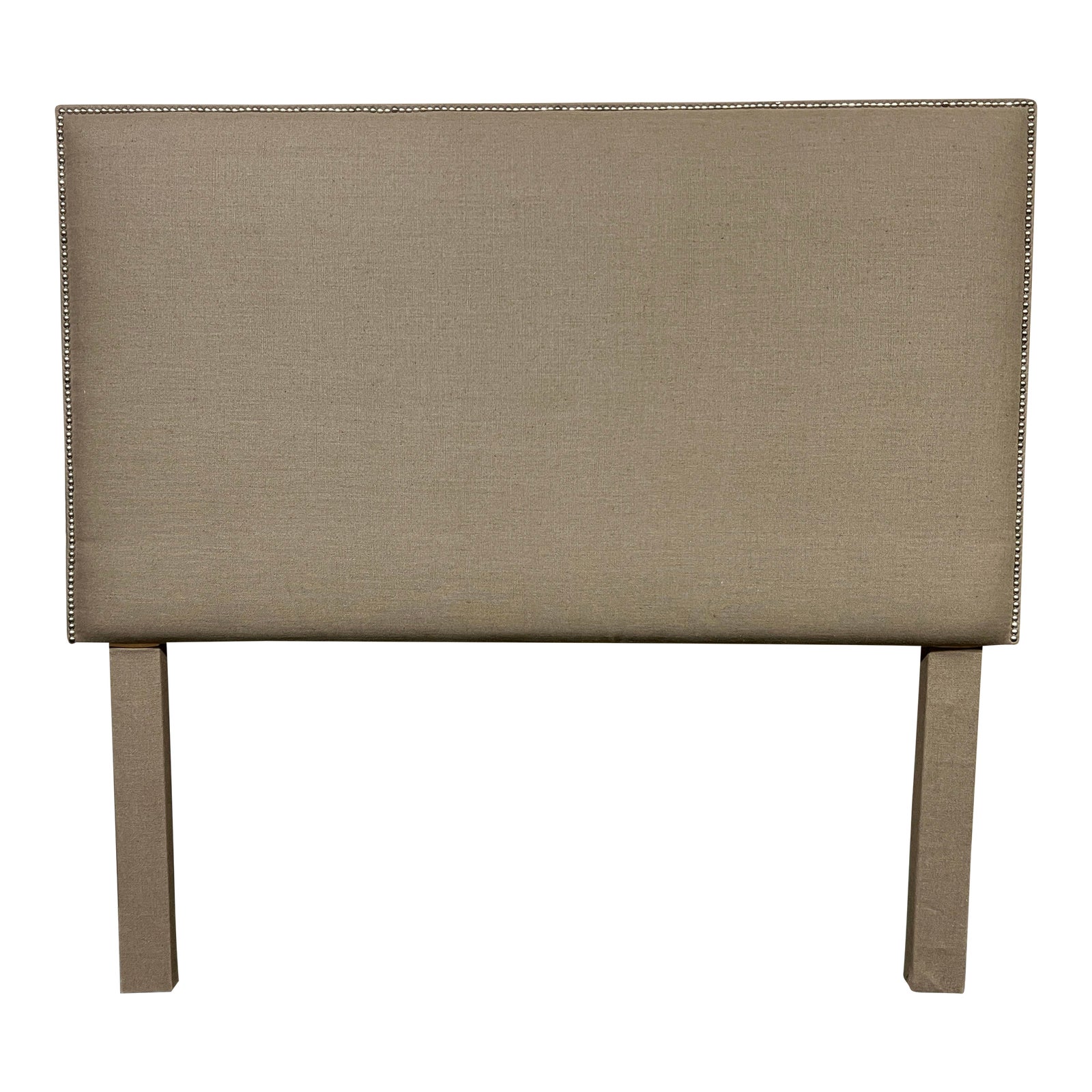 Design Plus Gallery presents a Queen Custom Linen Taupe Headboard by RL Studio. The frame is constructed with wood. The headboard is rectangular, upholstered with taupe-colored linen and accented with nail heads. The legs are rectangular and upholstered as well. Minor wear consistent with use; headboard is in good condition.