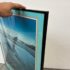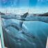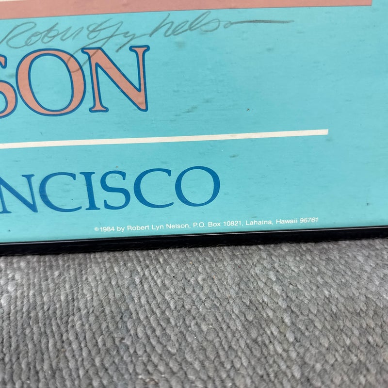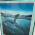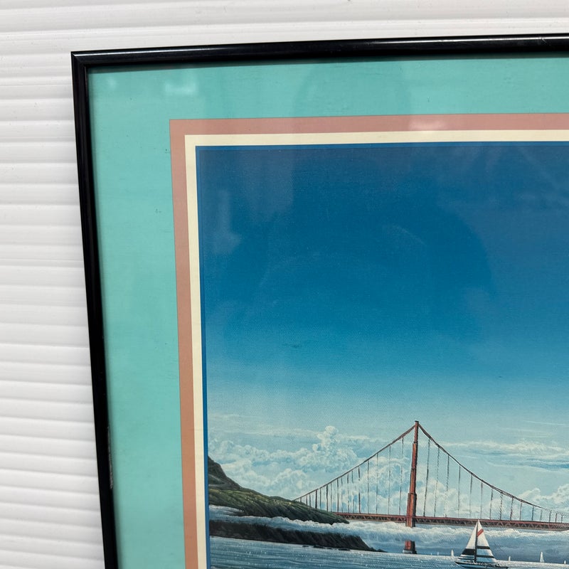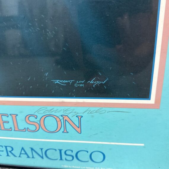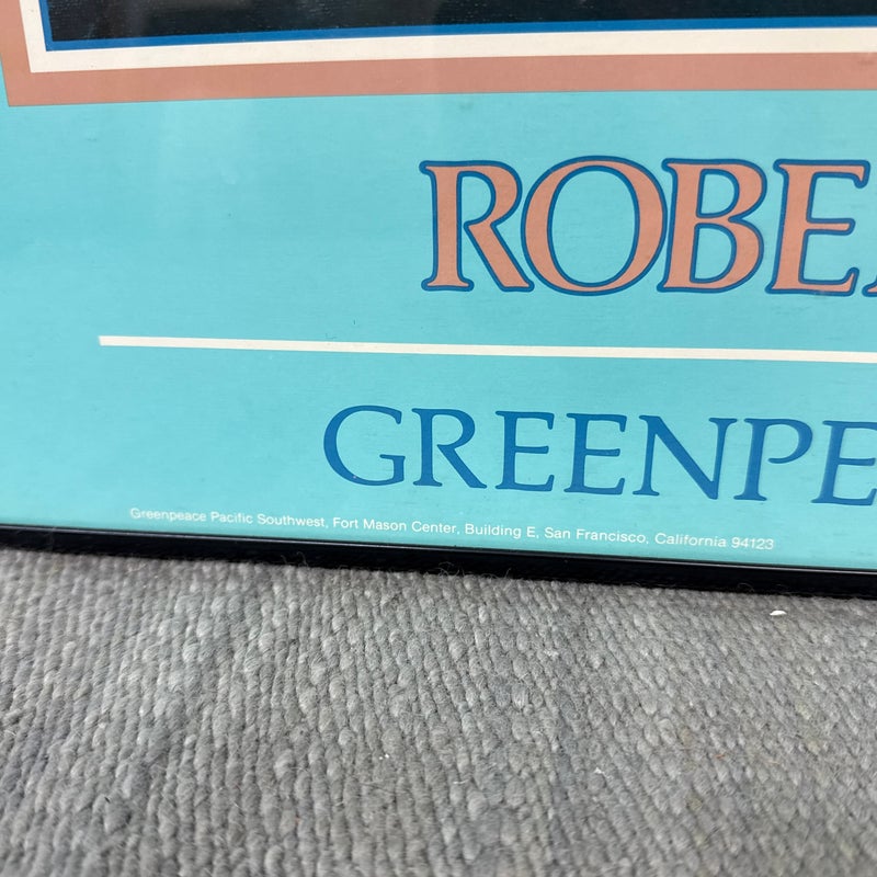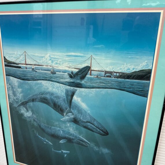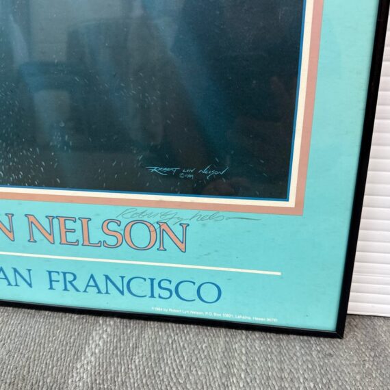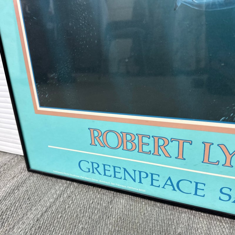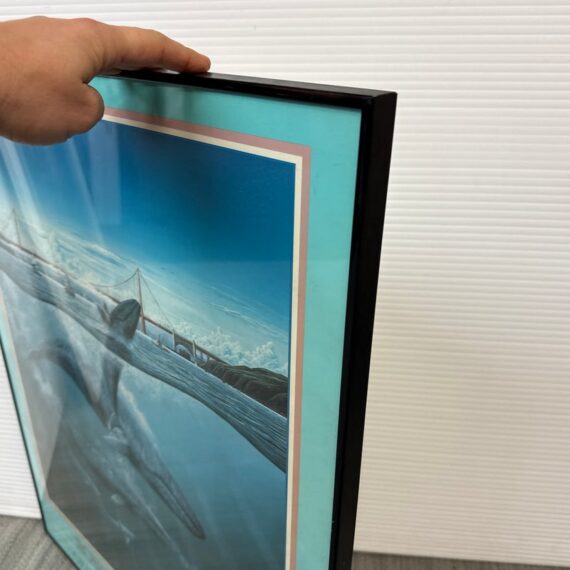 Design Plus Gallery presents a Greenpeace Poster by Robert Lyn Nelson. The organization made posters for each of its chapters in the United States and this one was done with colors of aquamarine and teal. The artists signature style of “Two Worlds” approach, which simultaneously depicts marine life below the surface and the landscape above. Other than being specific to San Francisco, the piece typically features whales, dolphins, or other marine life juxtaposed with coastal or urban imagery. The poster is held in a black metal frame and is in good overall condition for its usage.