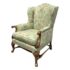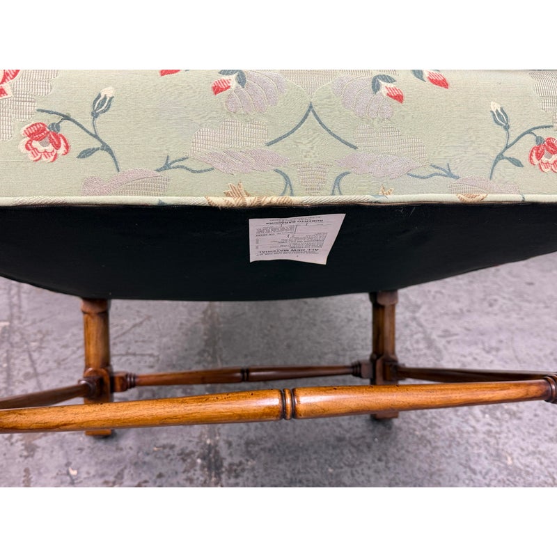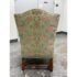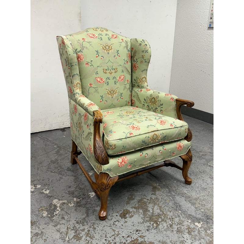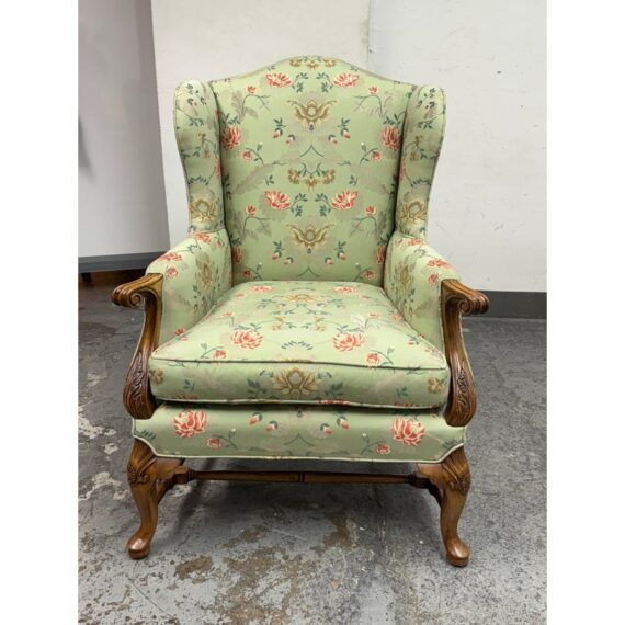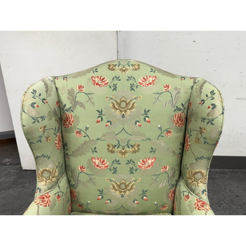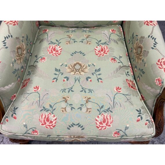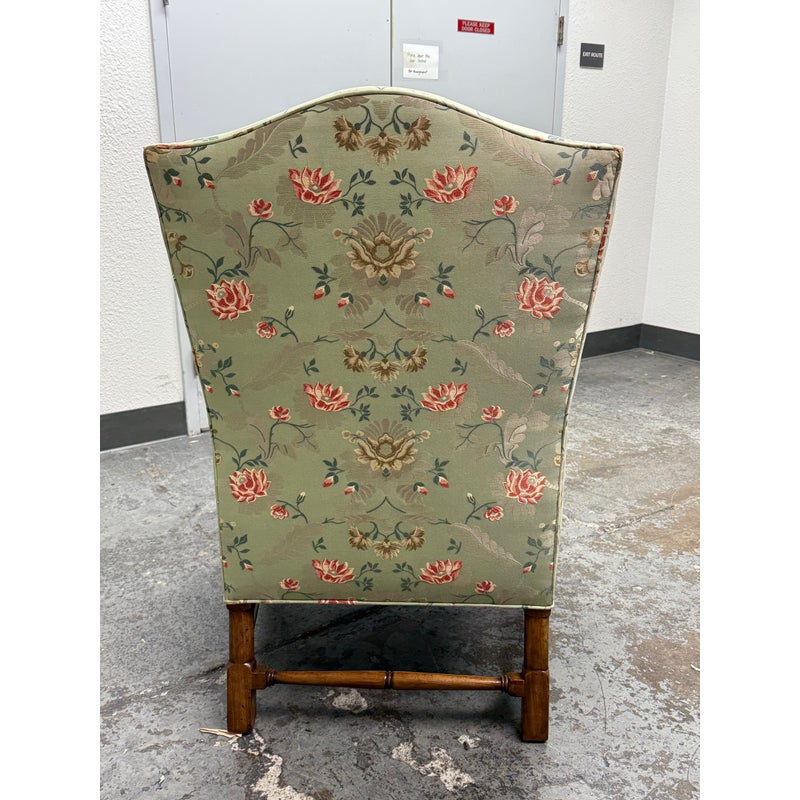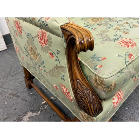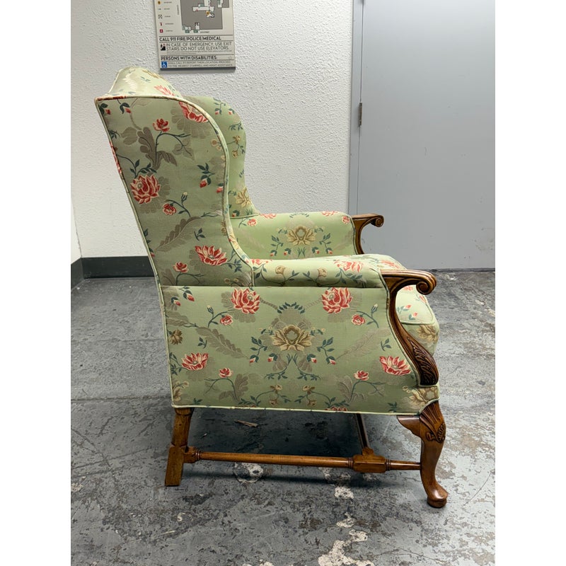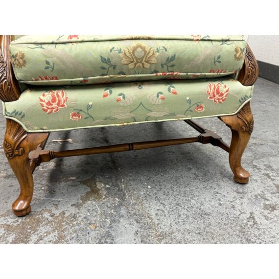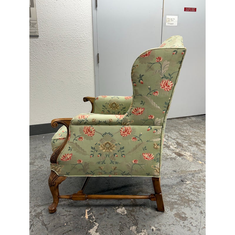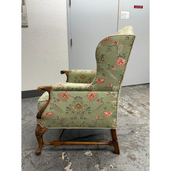 Design Plus Gallery presents a Burton Ching Arm Chair with Custom Upholstery by Roberto Barahona. The chair is in the George II Style, with a classic wingback design. The wood is artfully mastered with an acanthus leaf at the lowest part of each arm carved into the wood with a rounded hand hold at the top. The base has carbriole legs with upper shell carvings, reed shaped stretchers between each. The fine details are second fiddle to the finely sourced silk embroidered upholstery of flowers, birds and crests on a celery green silk jacquard. The chairs Is in good condition for its age with minimal surface wear that is consistent with use.