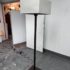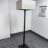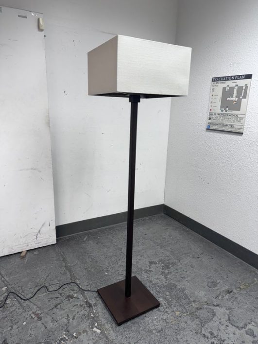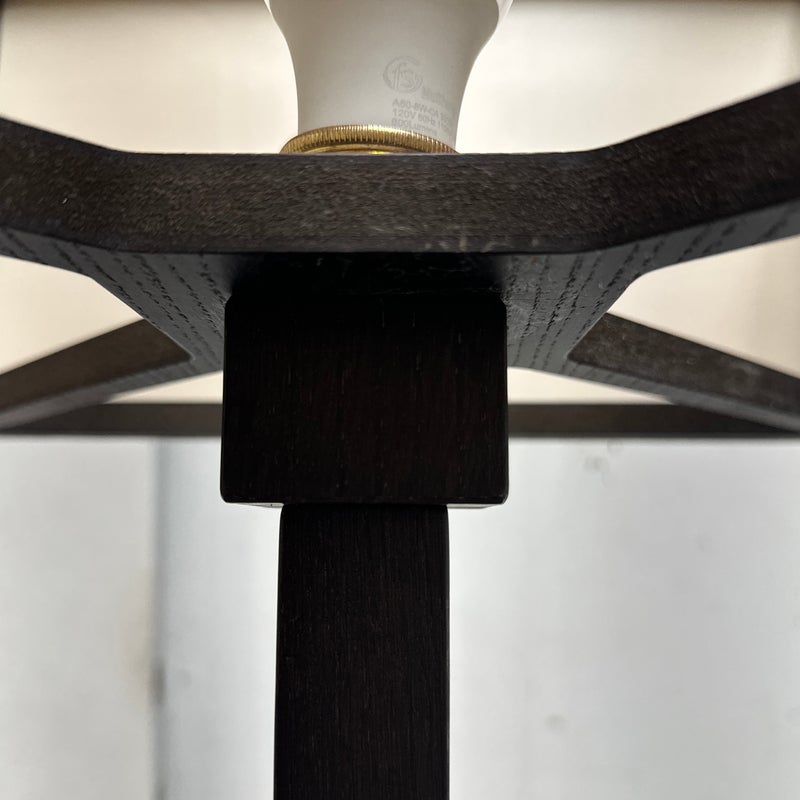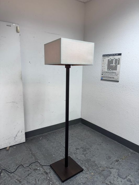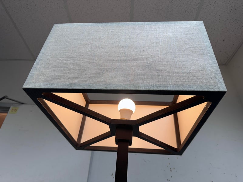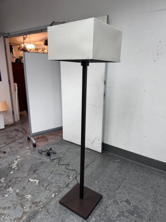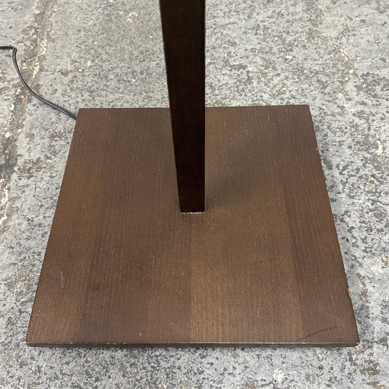 Design Plus Gallery presents a Floor Lamp by Roche Bobois. A wood frame base with wood frame shade wrapped in linen. In good condition, visible and minimal wear from usage + age. This is a discontinued model. Made in Italy.