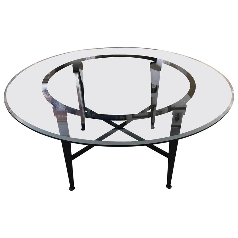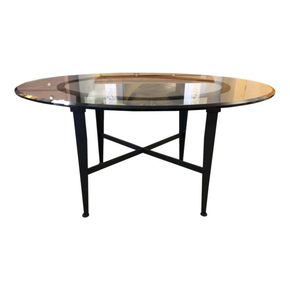 Design Plus Gallery presents an Italian dining table. Sourced from Roche-Bobois, the maker remains unknown. The clean lines require no embellishment and remain au Courant. Thick beveled round sits easily upon the iron structure.