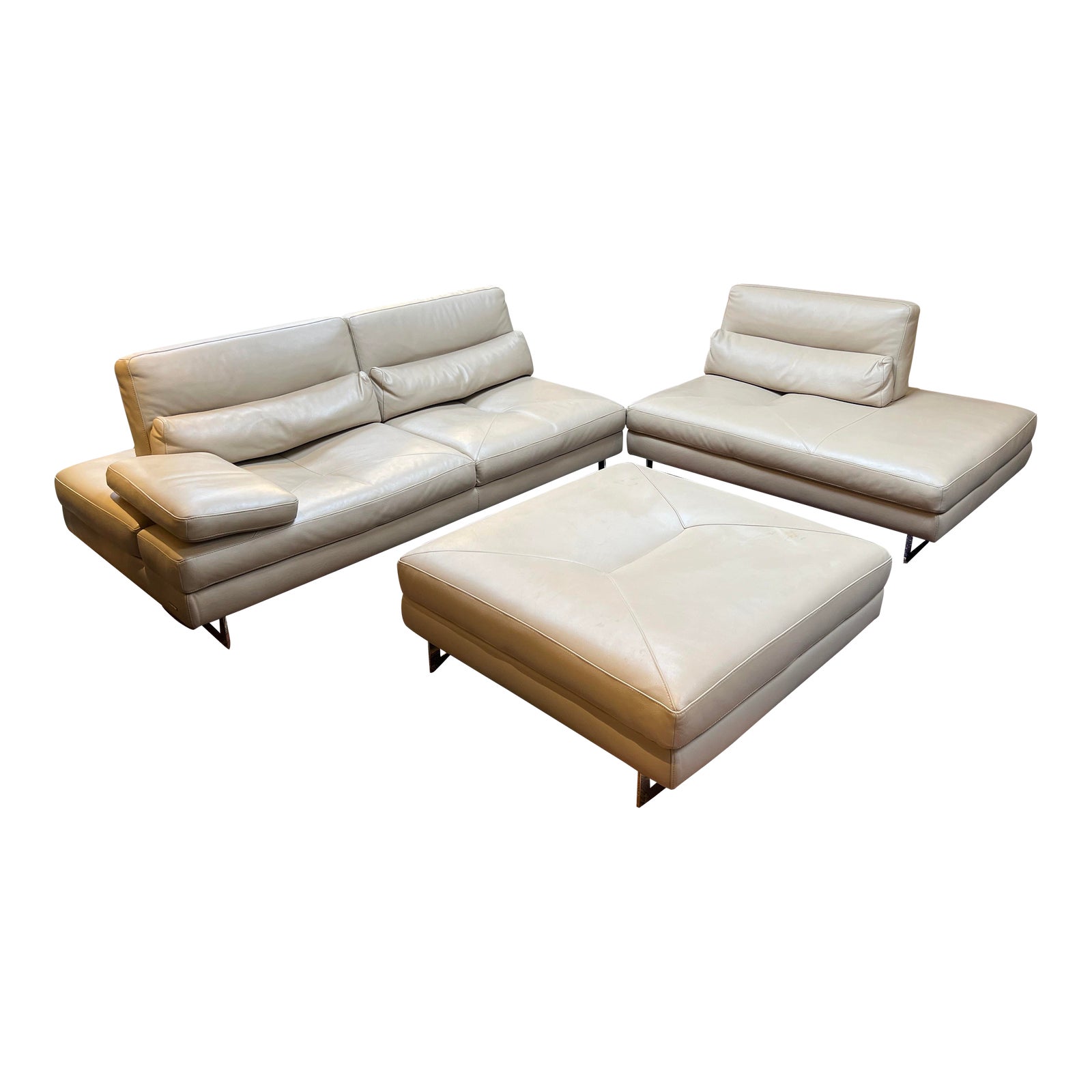Design Plus Gallery presents at the Scenario Sectional Sofa by Roche Bobois. Upholstered in lush leather with full grain and pigmented finish. Two end units have backs with double depth and adjustable mechanism. Left end unit has armrest that open to the side. Comfort provided by padded seat cushions, back cushions, armrest cushions and lumbar cushions all in HR foam and padding. Durable structure crafted in solid fir wood, pine plywood with HR elastic straps suspension. Modern styled base is of cast aluminum. There is visible wear consistent with age and use. Sectional sofa in good overall condition.