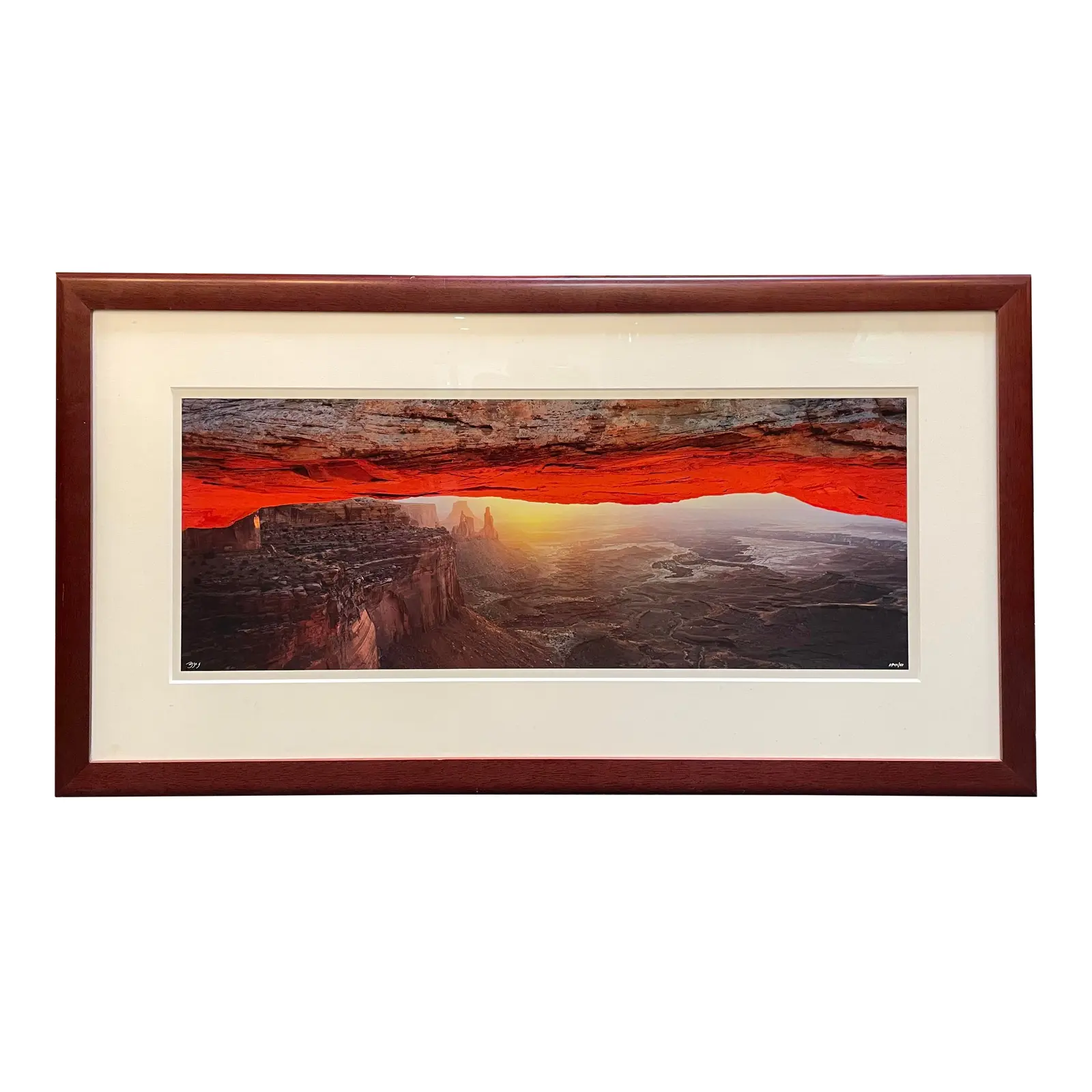 Design Plus Gallery presents the “Desire” Artists Proof, Ltd Edition Photography by Rodney Lough Jr. The awe inspiring view of sunrise from below a deep ledge, the Utah panorama will take your breath away. The large scale photo is hand signed in lower left corner/numbered in lower right corner, professionally matted and framed in deep red wood frame with Nature View Glass (anti-reflection, UV protective glass that is a higher quality than any museum glass available).