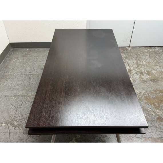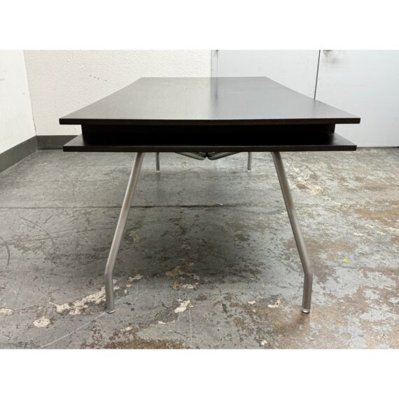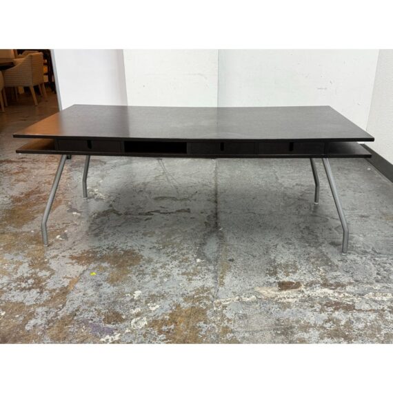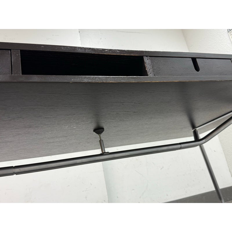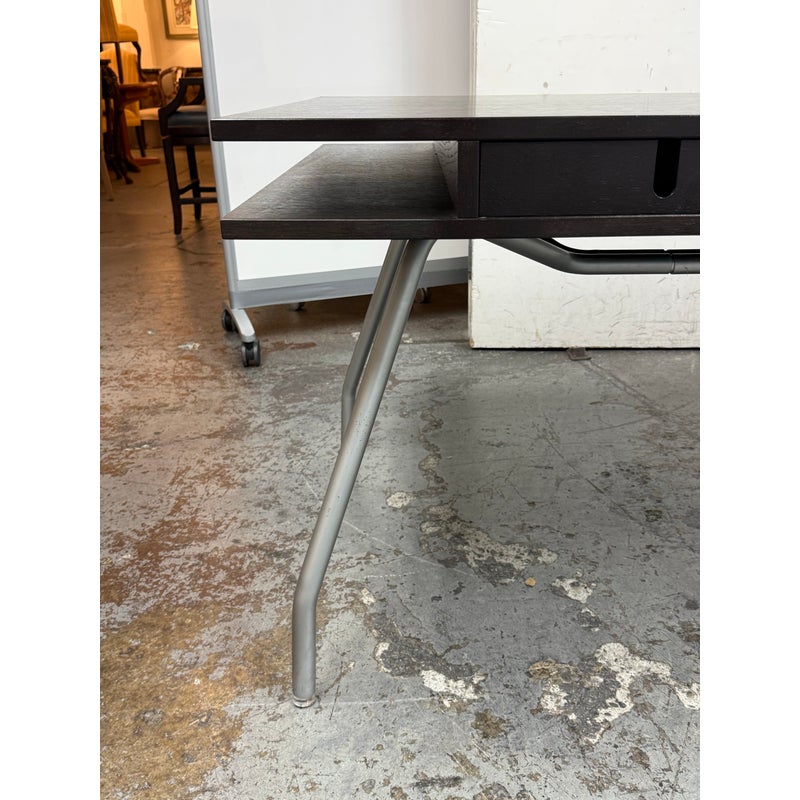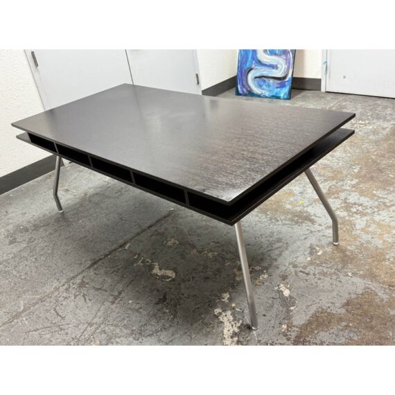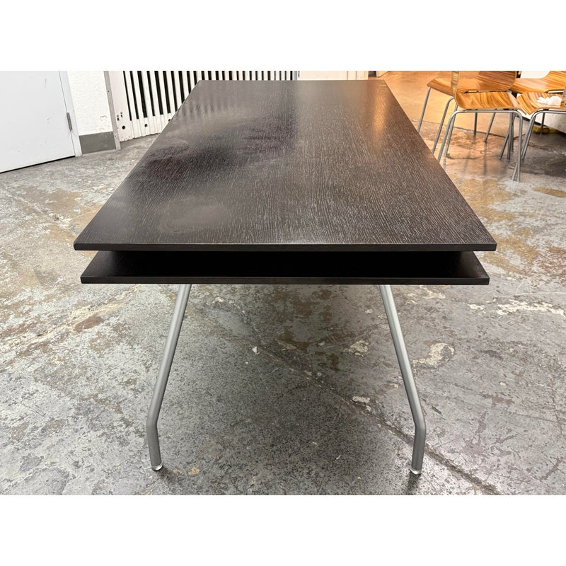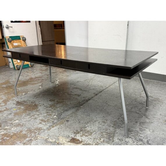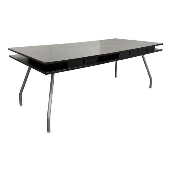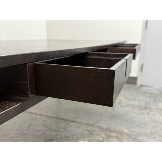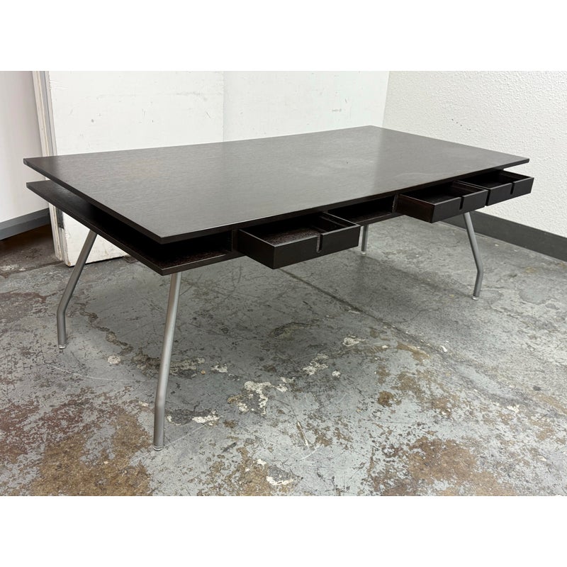 Design Plus Gallery presents an Open Cubby Desk with Drawers from Design Within Reach and Designed by Rodolfo Dordoni. The Dordoni Worktop on this desk is all about elegant function and ease. The angled table legs afford ample leg room for when you and colleagues pull up chairs for an impromptu conference. To cope with uneven floors, its glides are adjustable. The Dordoni Worktop holds up to eight roomy desk openings on each end offer convenient storage space for rolled up blueprints and drawings. Smart and spare, such a desk which easily doubles as a conference table makes you appreciate good design from the start to the end of the day. This style has been discontinued by the brand. There is visible surface wear, water marks and bubbly in veneer, to the dark wood finish. Overall good condition structurally.