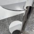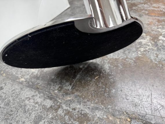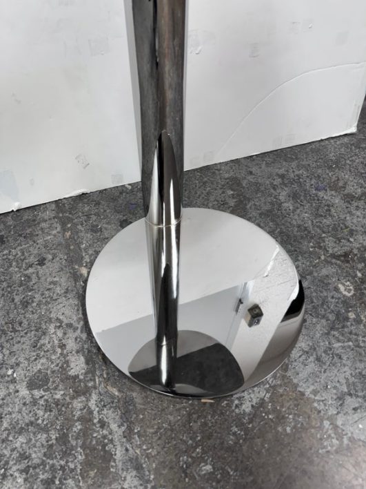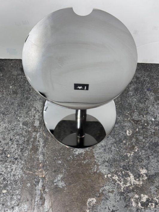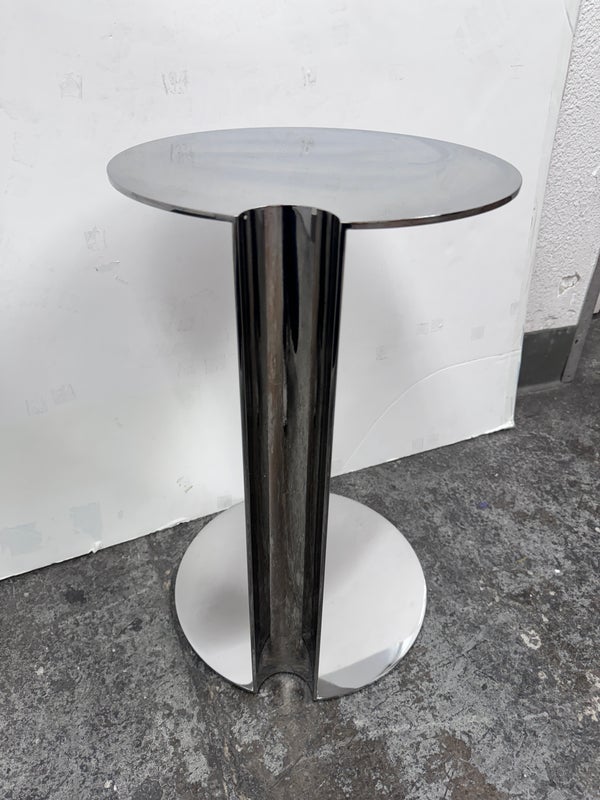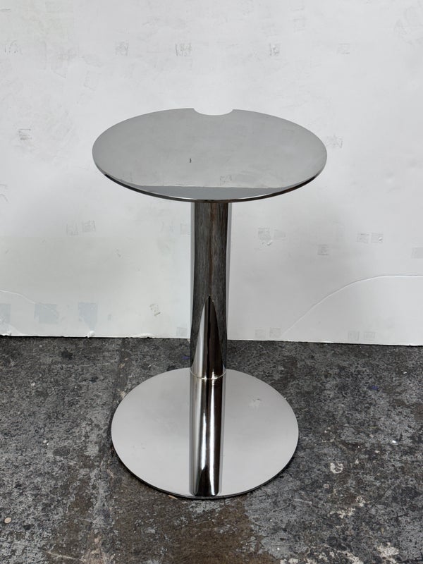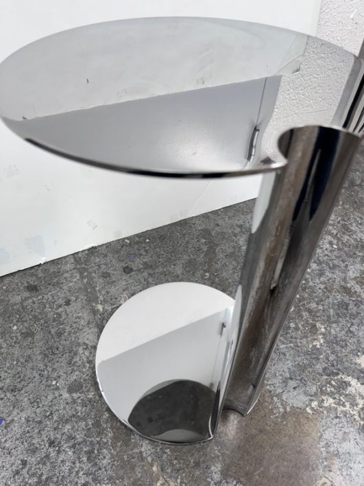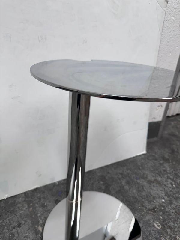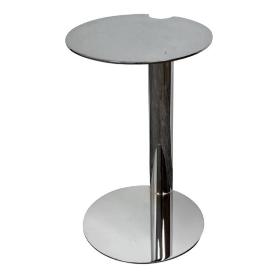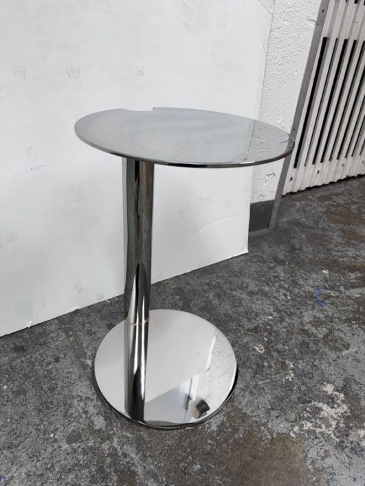 Design Plus Gallery presents the Nay Side Table Designed by Rodolfo Dordoni for Minotti. One singular chrome piece obtained by putting together two laser-cut discs and a curved plate. Chrome-plated finish with protective PVC glides. Has minor surface wear with some acknowledgement of scratches but overall in good condition.