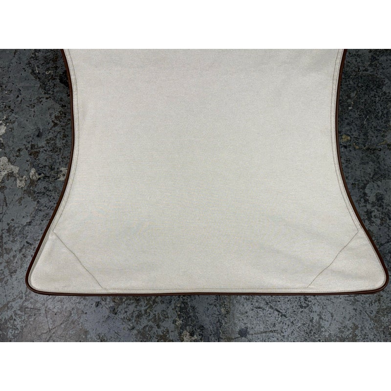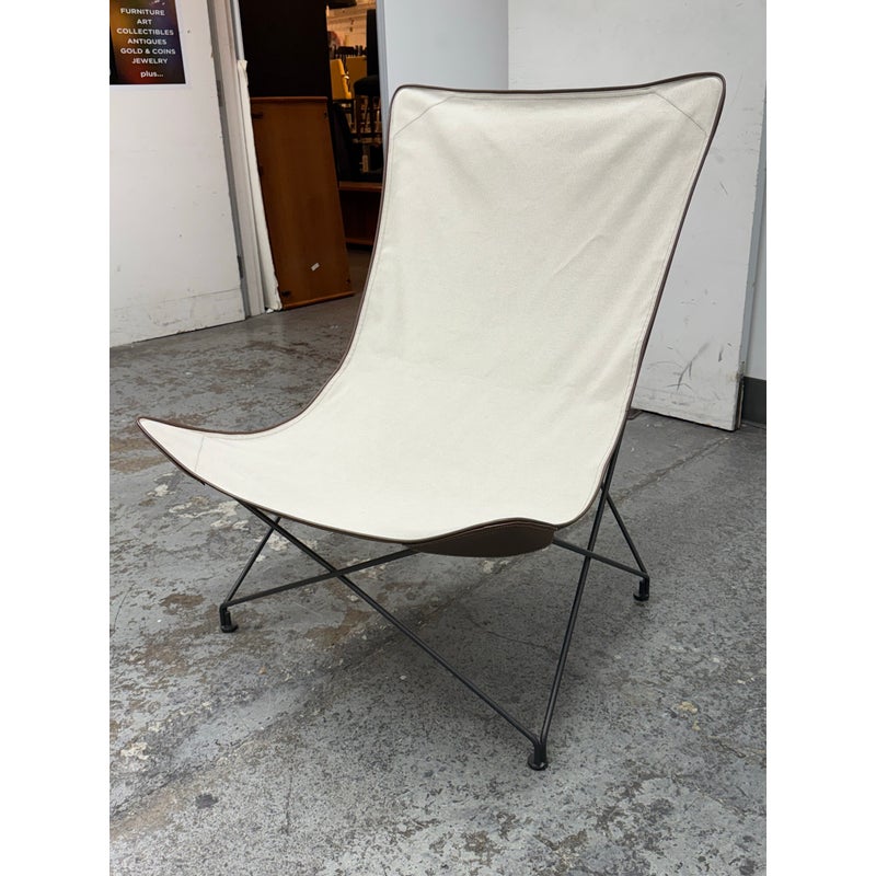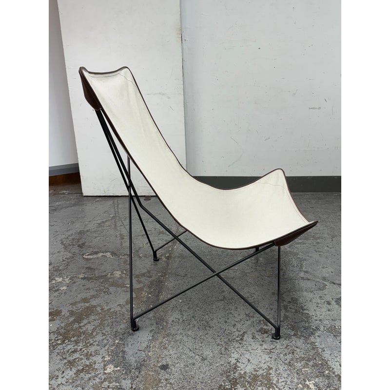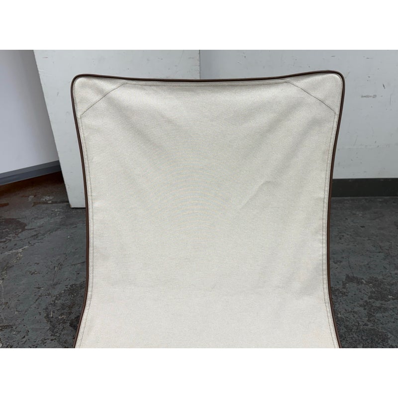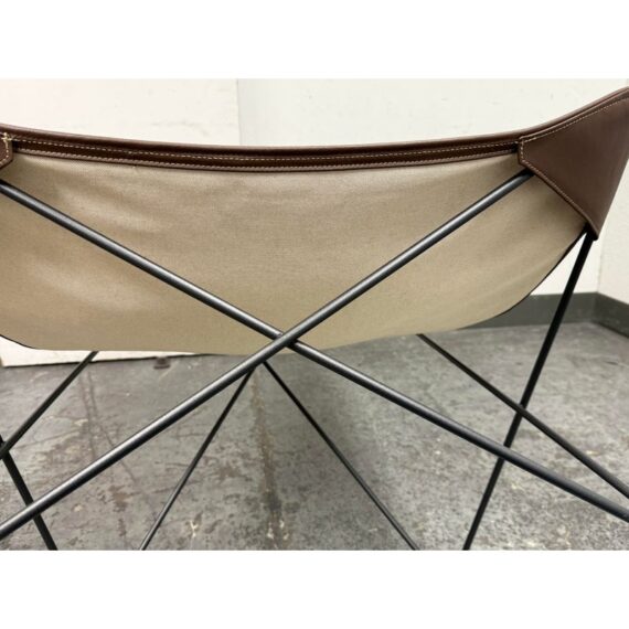 Design Plus Gallery presents a Lawrence 290 Lounge Chair from Roda. Designed by Rodolfo Dordini. Essential and timeless, distills comfort into pure geometry. A taut, impermeable cotton canvas with refined leather inserts slips over the vertices of four structural triangles, creating a suspended seat that seems to float within a graphic frame of black-finished metal wire. The result is light yet architectural, tactile yet precise—a lounge chair that blends material warmth with a crisp, contemporary silhouette. Was a Showroom Sample, In good condition, minimal wear from usage. Made in Italy.
