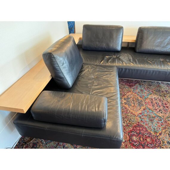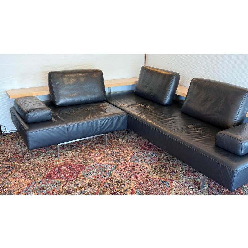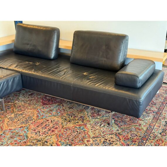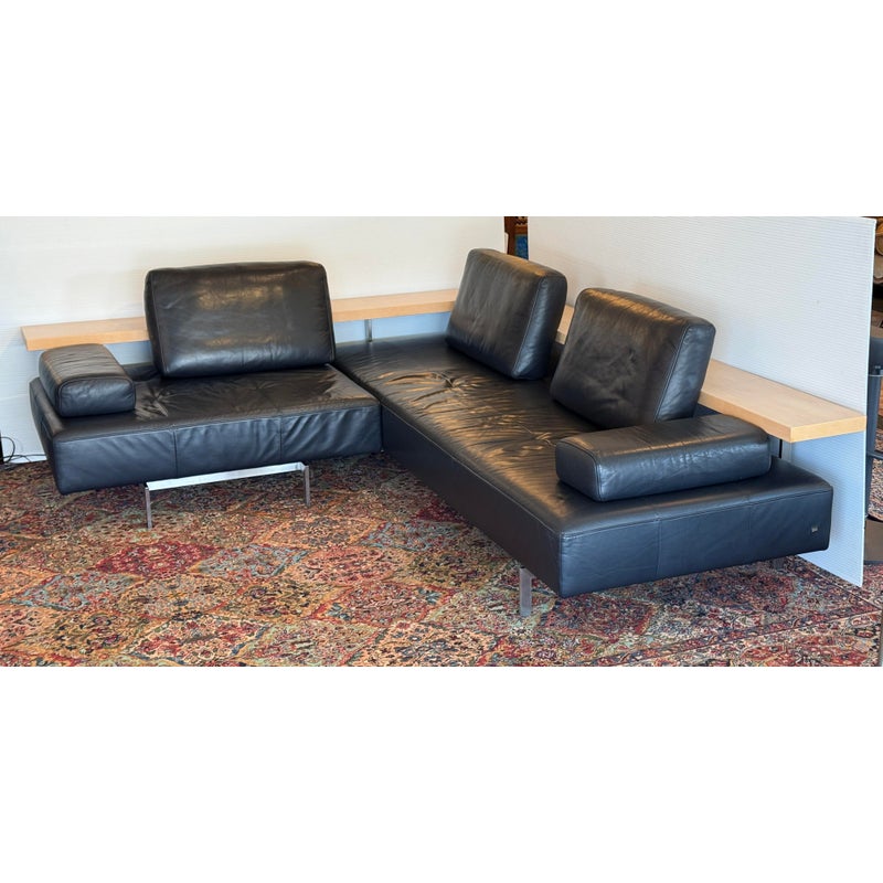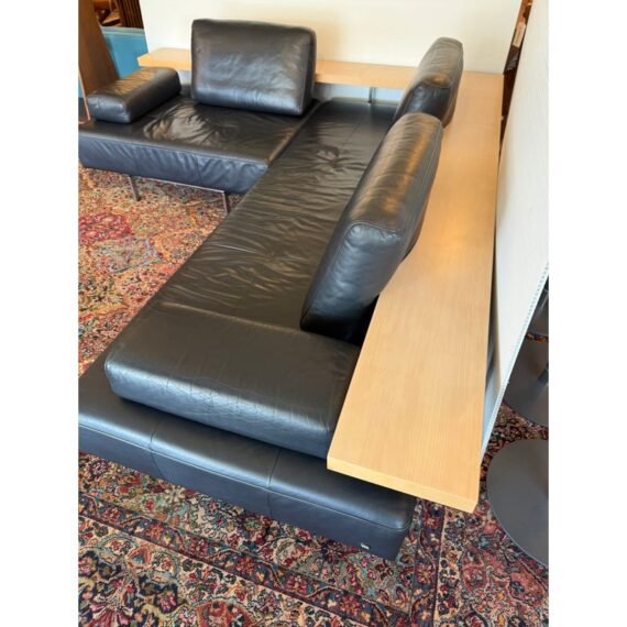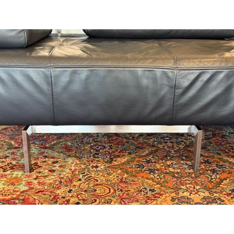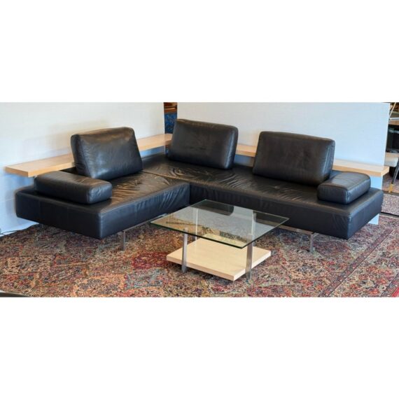 Design Plus Gallery presents the Dono Sectional by Rolf Benz. Since its introduction in 2004, this design has become Rolf Benz’s most popular product. Its distinctive appearance is achieved through a continuous rail made of lush black leather, oak and veneer that is combined with a matte brushed stainless steel frame. This combination not only gives the Dono its recognizable look but also serves as a practical shelf. The modern sofa offers a variety of seating positions due to its loose side cushions and back cushions, which can be attached at different locations. Additionally, the optional seat depth adjustment feature allows you to adjust the seat depth on the small section, ensuring you find a comfortable position to relax in quickly. Light surface wear; condition is good for age and use. Original Price $18,000