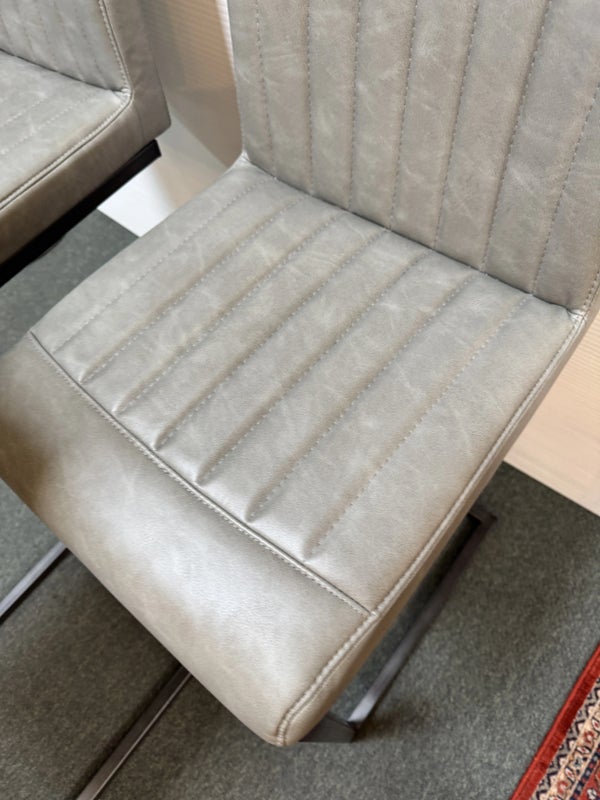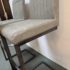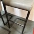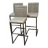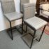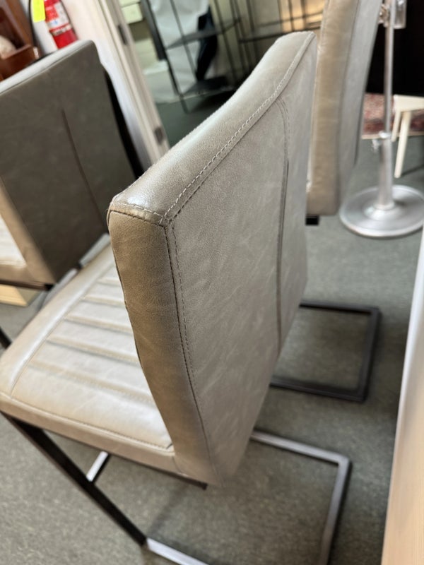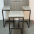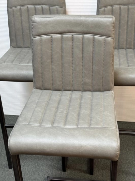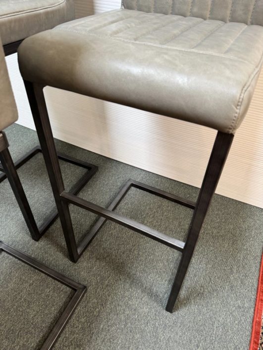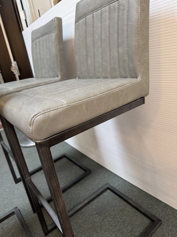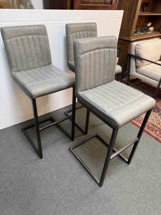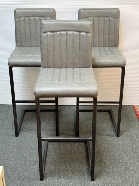 Design Plus Gallery presents a Set of 3 Ronan Barstools. Simple silhouette, perfect for industrial or mid century environs, is channel tufted in cushioned graphite gray leather and faux leather then elevated on dark gray rubbed iron base. Light wear; condition is consistent with age and use.