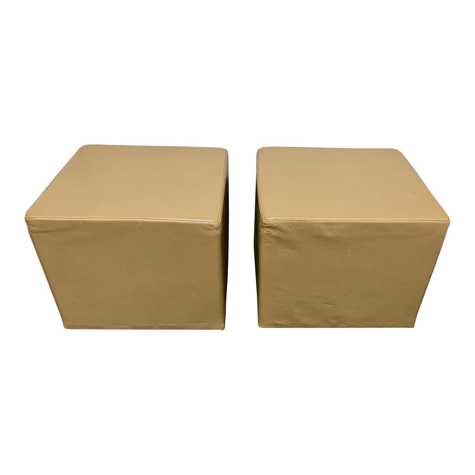 Design Plus Gallery presents a Pair of Aero Leather Square Ottomans by Room & Board. The frames are constructed with wood and cushioned with high-density foam. Their upholstery is leather in a champagne color. Clean lines and angles provide modern appeal. Usable as a seat, footrest, or end table/coffee table. Minor wear consistent with use; ottomans are in good condition.