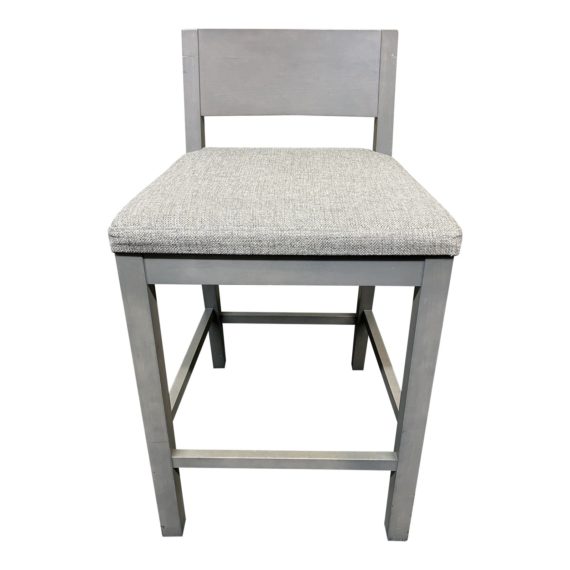 Design Plus Gallery presents a Room & Board Afton Counter Stool. Gray washed solid wood frame has a modern silhouette with a subtly curved back for comfort. Upholstered in a neutral gray woven fabric. Little evidence of wear; overall good condition. Made in Vermont, USA.