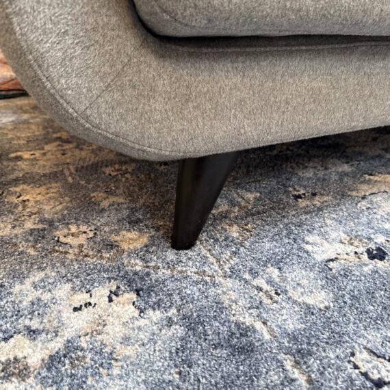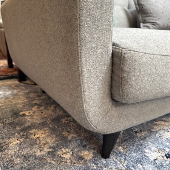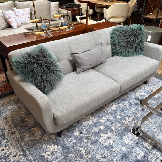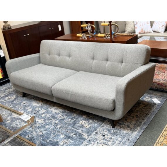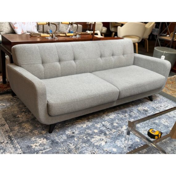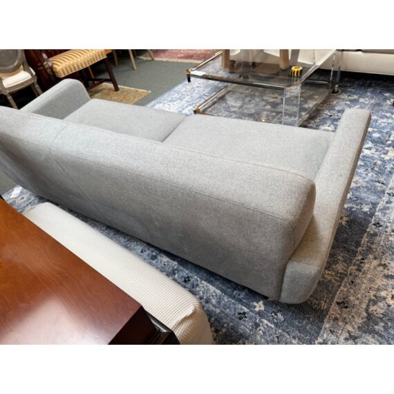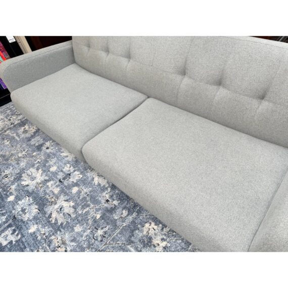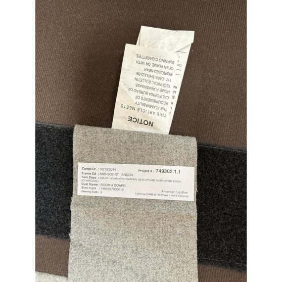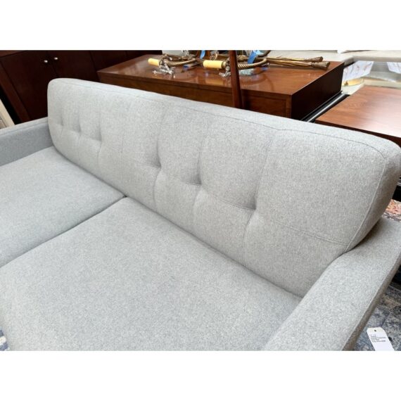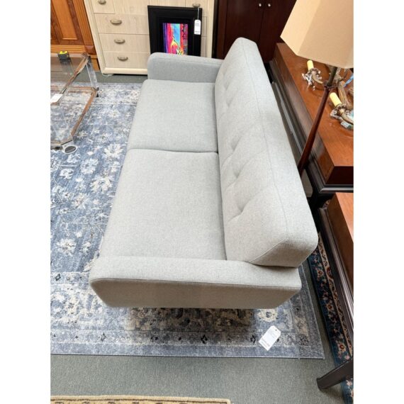 Design Plus Gallery presents the Anson Sofa by Room & Board. Manufactured by American Leather. Sofa sits low with small flared wood feet. Back is fixed with a blind tufted detail for a firm and supportive experience. Sofa is in good condition, missing center tuft; minor wear from usage + age. Made in USA.