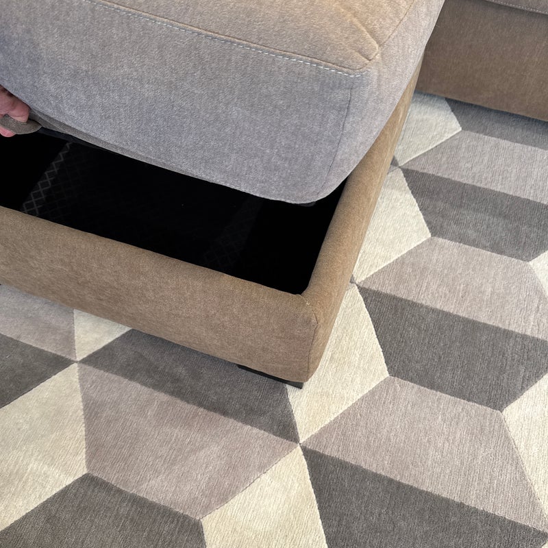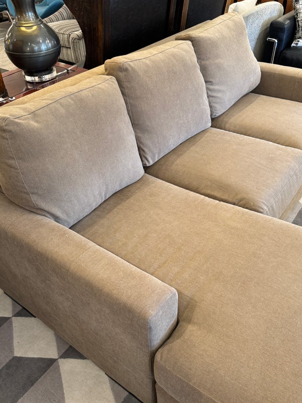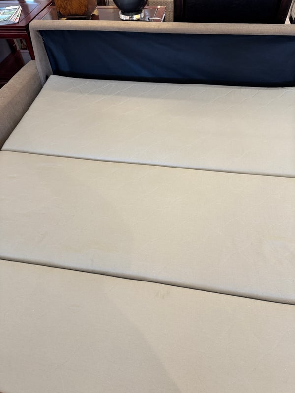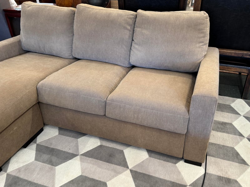 Design Plus Gallery presents a Berin Two Sectional Sleeper + Storage Ottoman by Room & Board. Simple lines and a comfortably angled back give this sleeper sectional a modern yet relaxed profile. Providing the most comfortable sleep experience, Day & Night sleeper sectionals have traditionally sized mattresses that fold out onto a trifold sleep surface alongside the chaise. The chaise has a hidden storage for your sleeper essentials. In good condition, visible and minimal wear from usage + age. Made in USA.