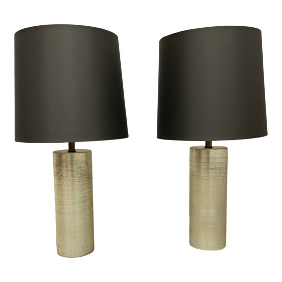 Design Plus Gallery presents a Pair of Birch Style Lamps + Black Shades by Room & Board. The base is cylindrical, spun to give a birchwood-like appearance. It is metallic and finished in a silver/gold leaf blend. The shades are also cylindrical, with white interiors and black exteriors. Each lamp uses one light bulb and has a turn switch. Minor wear from use; lamps are in good condition.