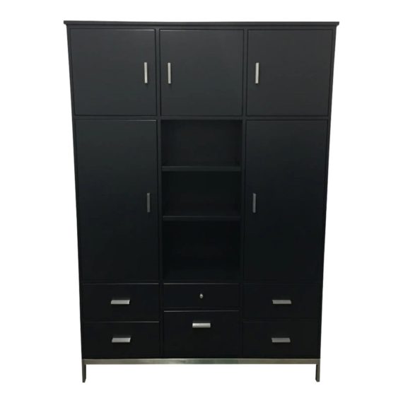 Design Plus Gallery presents a Linear office credenza by Room & Board. This piece has a series of doors and drawers including one hanging file drawer. All of this to help keep you organized, but you have to do your part. The credenza was constructed using solid Maple. The entire unit has been Lacquered Black in a satin finish. It sets on a brushed Stainless base which matches the drawer pulls. One lower left drawer does not open all the way. There is visible and minor wear on the surface. Made in USA.