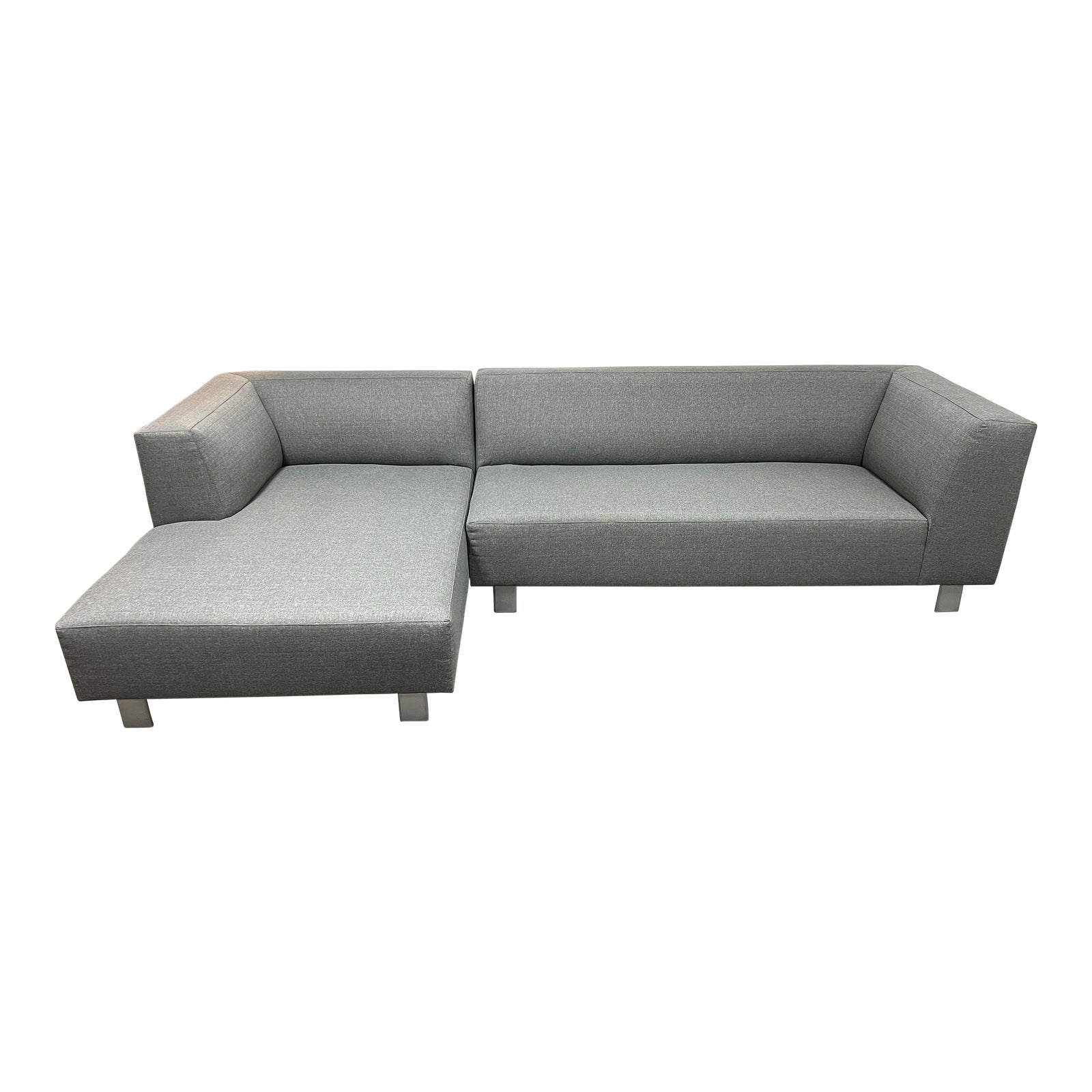 Design Plus Gallery presents a Two Piece Chelsea Sectional by Room & Board. A true contemporary classic, offers firm, supportive comfort without the fuss of fluffing pillows or flipping cushions. Clean design features a tight back and seat and precise seams to showcase the sculptural shape and distinctive metal legs. Upholstered a light gray fabric, the legs are metal. Minor wear from usage. Made in Virginia, USA. This is a discontinued model