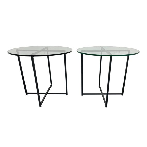 Design Plus Gallery presents a Pair of Classic Side Tables by Room & Board. Designed in 1990. A versatile classic end table features a clean, simple design. A hand-welded recycled natural steel base with a clear round glass top. Minor wear, Made in Minnesota, U.S.A.