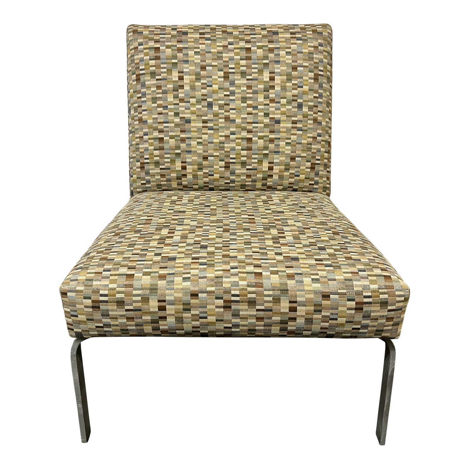 Design Plus Gallery presents the Room & Board Contemporary Side Chair. Rectangular folded chrome beams support this contemporary silhouette. The armless seat is upholstered with a durable fabric featuring an abundance of colors in a neutral geometric pattern. Minor wear from use; chair is in good condition.