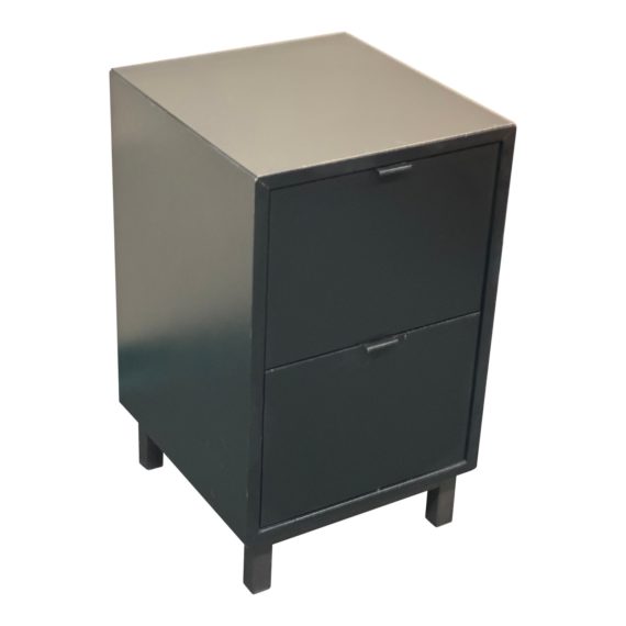 Design Plus Gallery presents a Copenhagen File Cabinet by Room & Board. Crafted from woods with a black finish. Features two drawers with metal hardware and legs. Visible scratches and wear from usage + age. Made in North Dakota, USA.