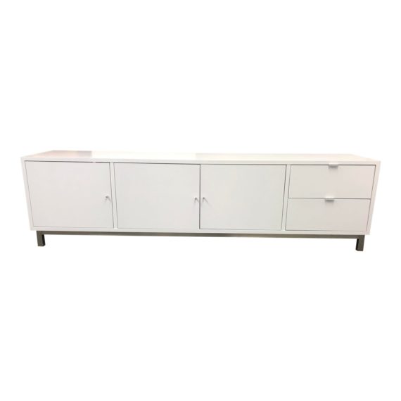 Design Plus Gallery presents a custom Room and Board Media Cabinet. Two drawers three cabinets brings plenty of storage for all your media gadgets. The legs and hardware are stainless steel. The elegance and modern design will modernize your living room, but keeps things simple at the same time.