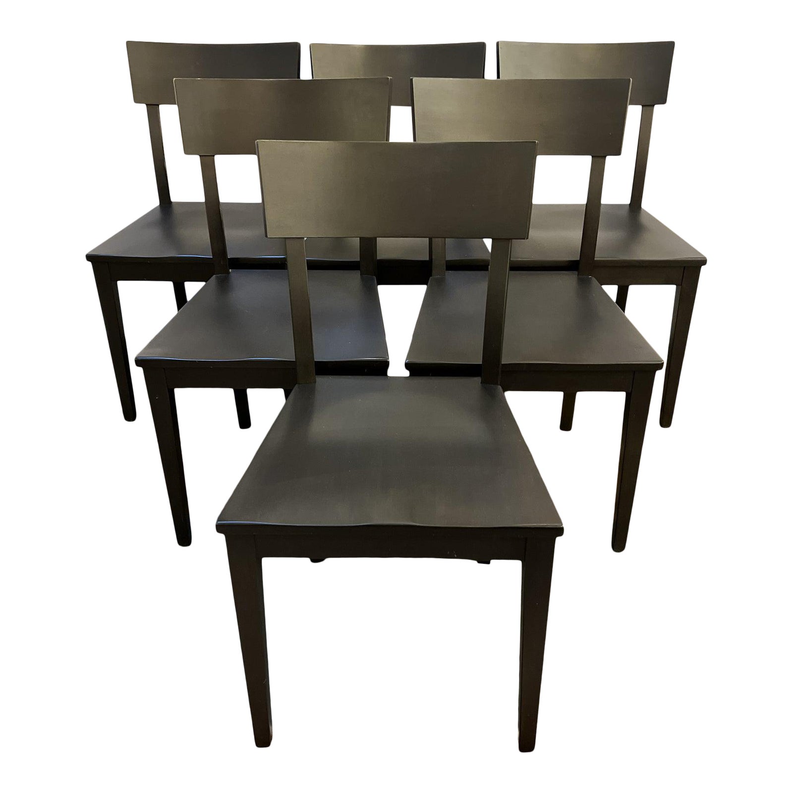 Design Plus Gallery presents the Room & Board Doyle Side Chairs. Constructed with maple wood and given a charcoal stain. The seats feature grooves for added comfort. These petite chairs are ideal for small spaces, yet stately enough for a formal dining room. Wear is consistent with use; chairs are in good condition.