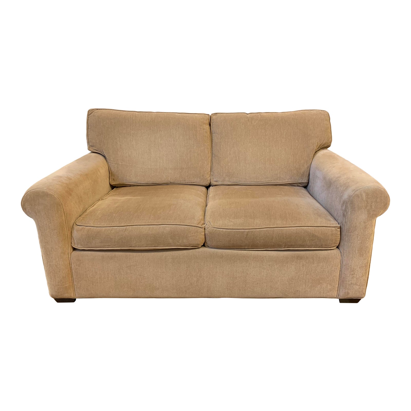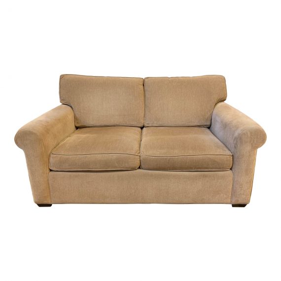 Design Plus Gallery presents a Room and Board Foster Loveseat. Soft chenille fabric and removable cushions wrap around sloped arms and low back. Small scale can work in a variety of spaces. Minor wear on fabric. Neutral upholstery easy to match to scheme.