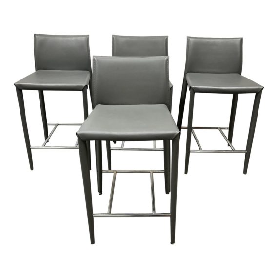 Design Plus Gallery presents a Set of Four Room & Board Grey Leather Counter Stools. Solid metal interior frame is lined with Italian leather for a sharp and inviting easy to take care of every day set. Trestle base has incorporated foot rest and is made of polished chrome and does show some age patina and wear.