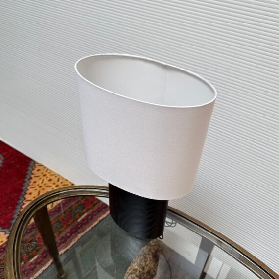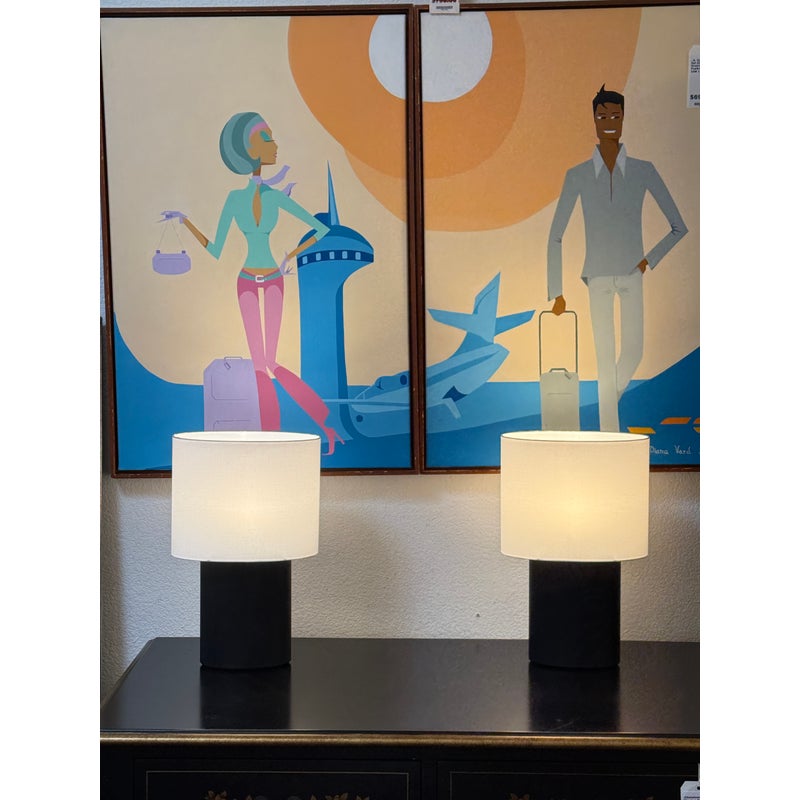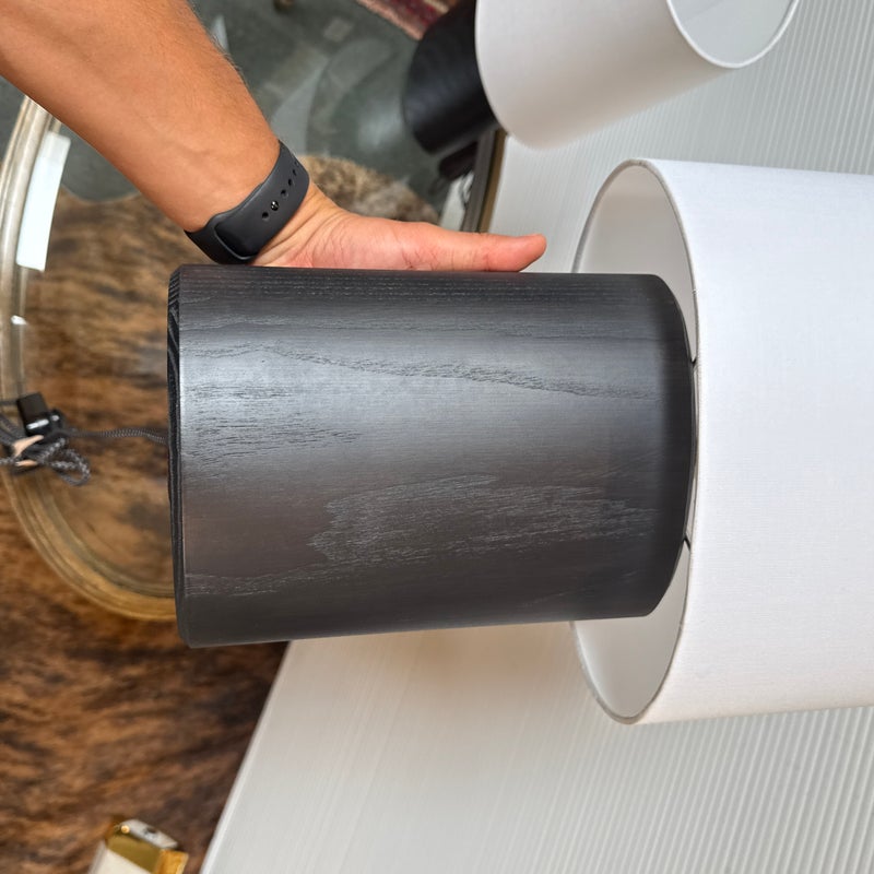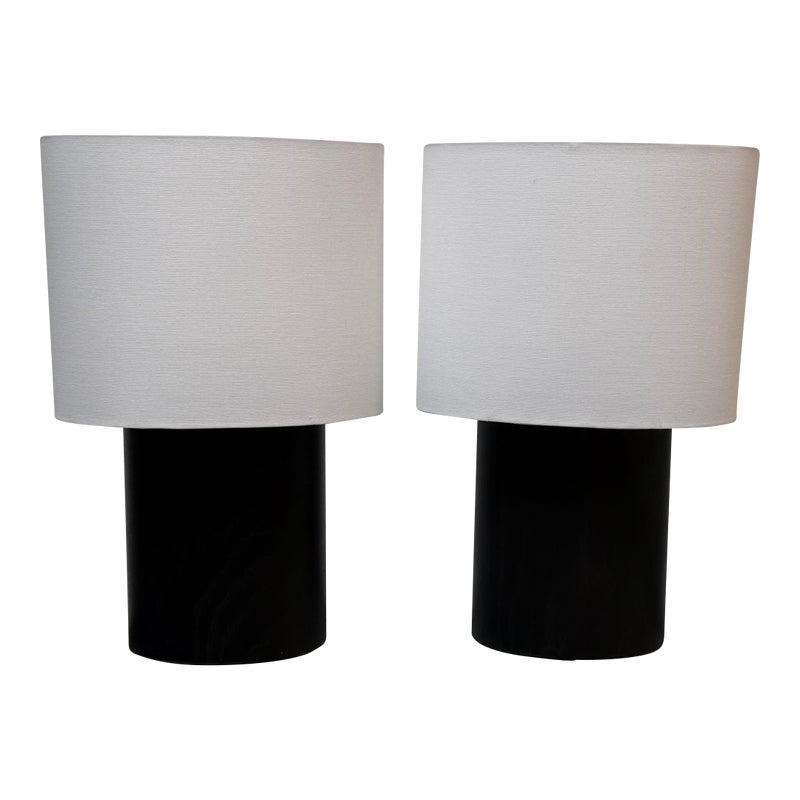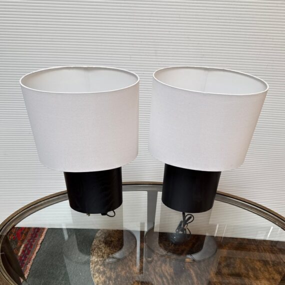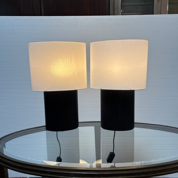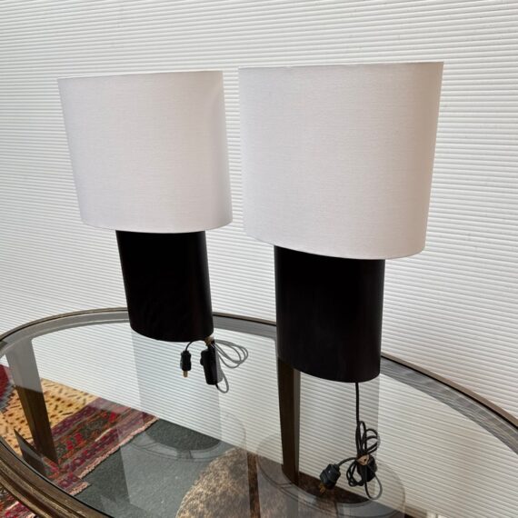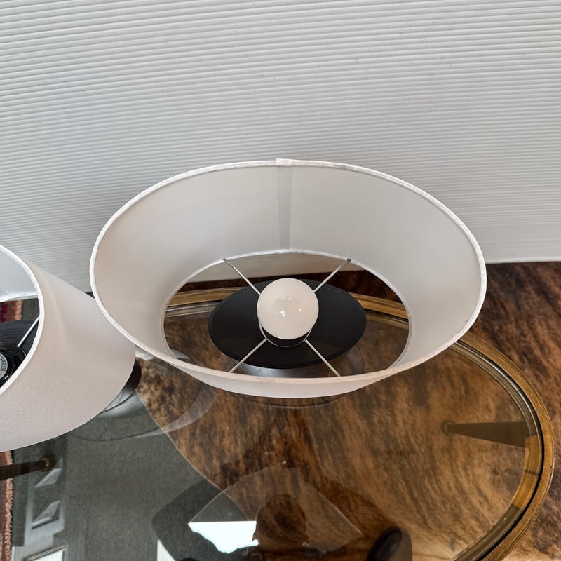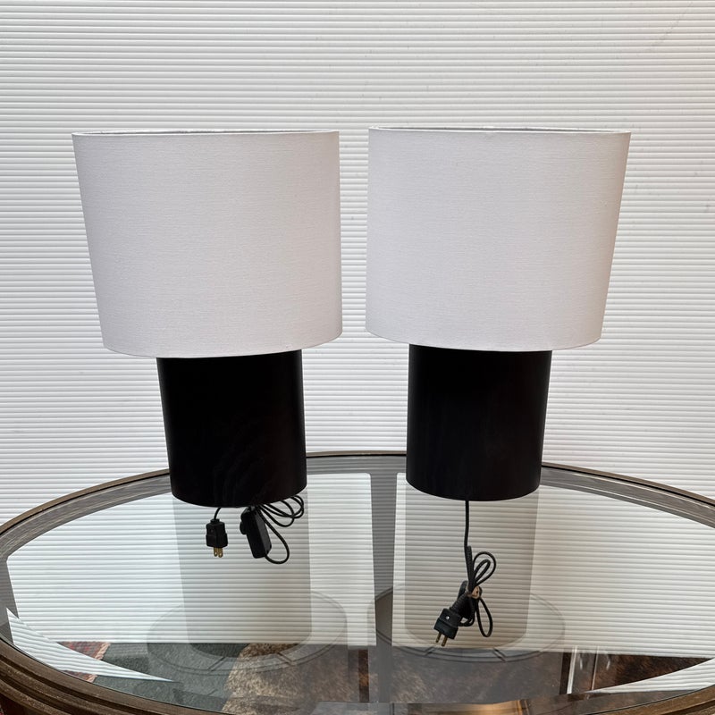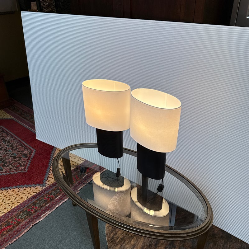 Design Plus Gallery presents a Pair of Haddie Table Lamps from Built by Newport for Room & Board. The lamp’s offer a unique and elliptical shape to set them apart. They have a charcoal-stained solid ash wood base that stabilizes it. Their compact footprint makes them suitable for various spaces. These lamps are proudly made in Vermont, USA. Little wear; condition is good.