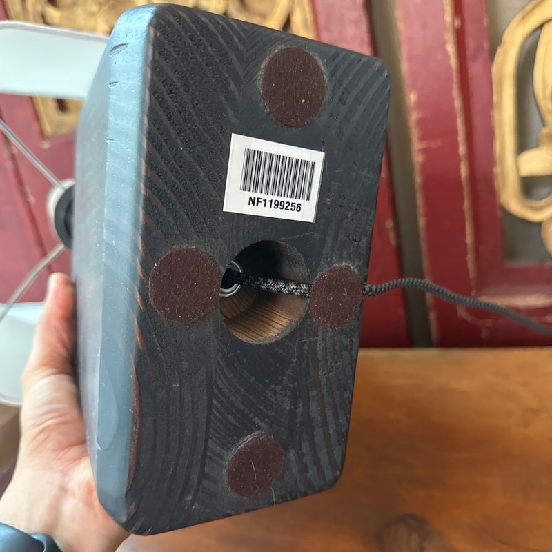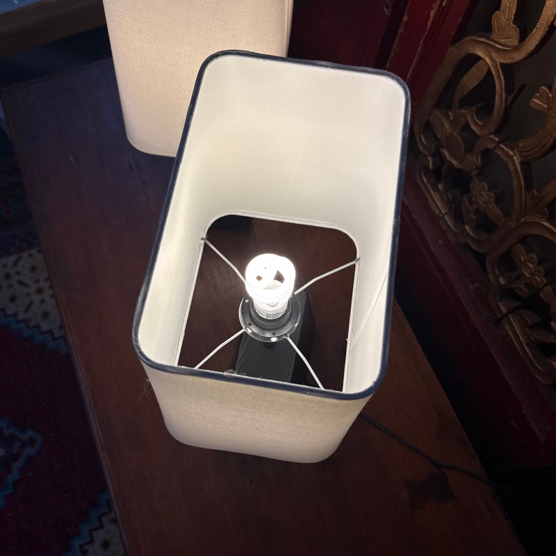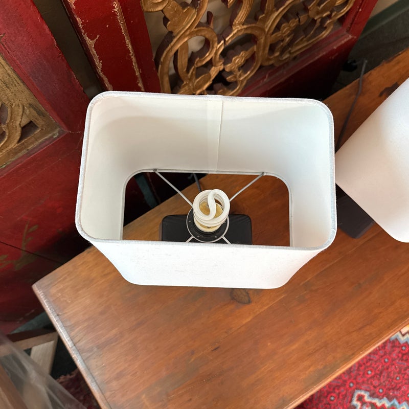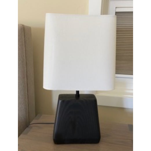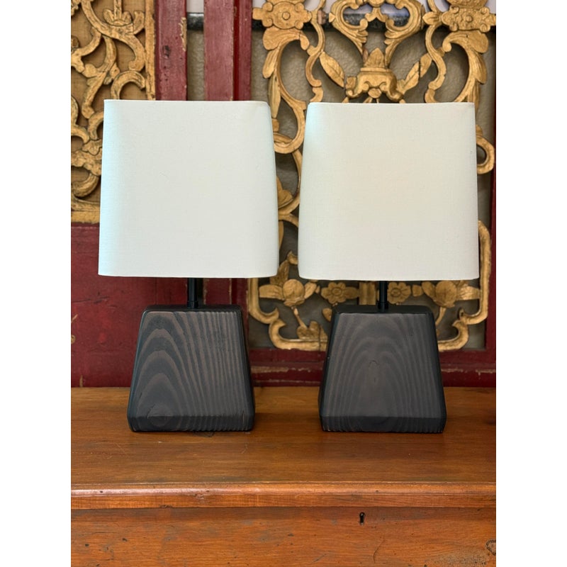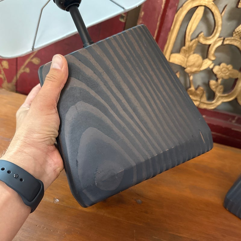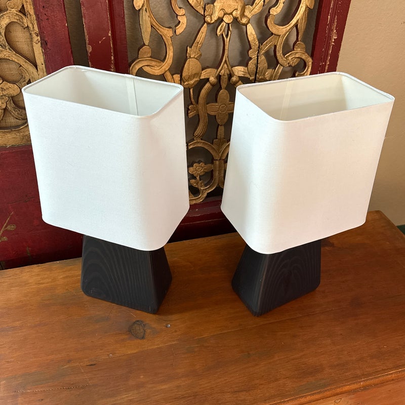 Design Plus Gallery presents a Pair of Henson Table Lamps from Room & Board. This lamp’s unique, chunky shape sets it apart. The charcoal-stained sustainable solid ash base anchors the lamp, while its shade appears to float above it. A compact footprint makes it suitable for various spaces. This lamp is made in Vermont, USA. Little wear; condition is good.