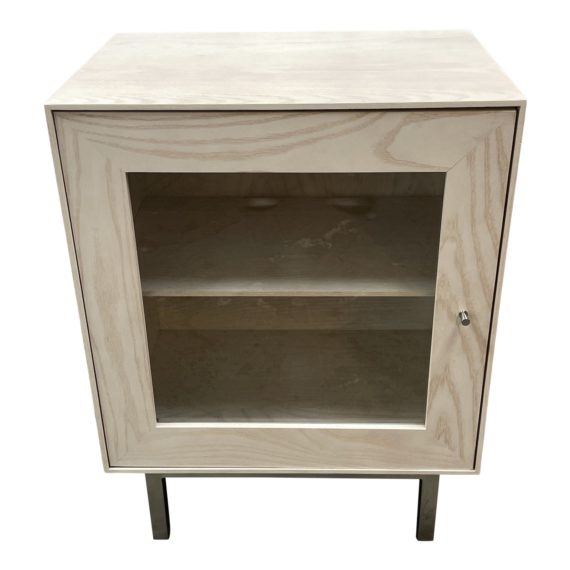 Design Plus Gallery presents a Hudson Cabinet by Room & Board. Built to be rock solid, this modern cabinet is handcrafted in West Virginia by skilled artisans, who share their pride by signing the back of each piece. The natural grain of sustainably sourced U.S. solid wood is the perfect backdrop for the sleek, timeless design of this collection. The frame is Ash with a Sand Finish. The base and hardware are stainless Steel. The swing open door has a glass front that reveals an adjustable single shelf. Minor wear on top from usage. Handcrafted in West Virginia, USA.