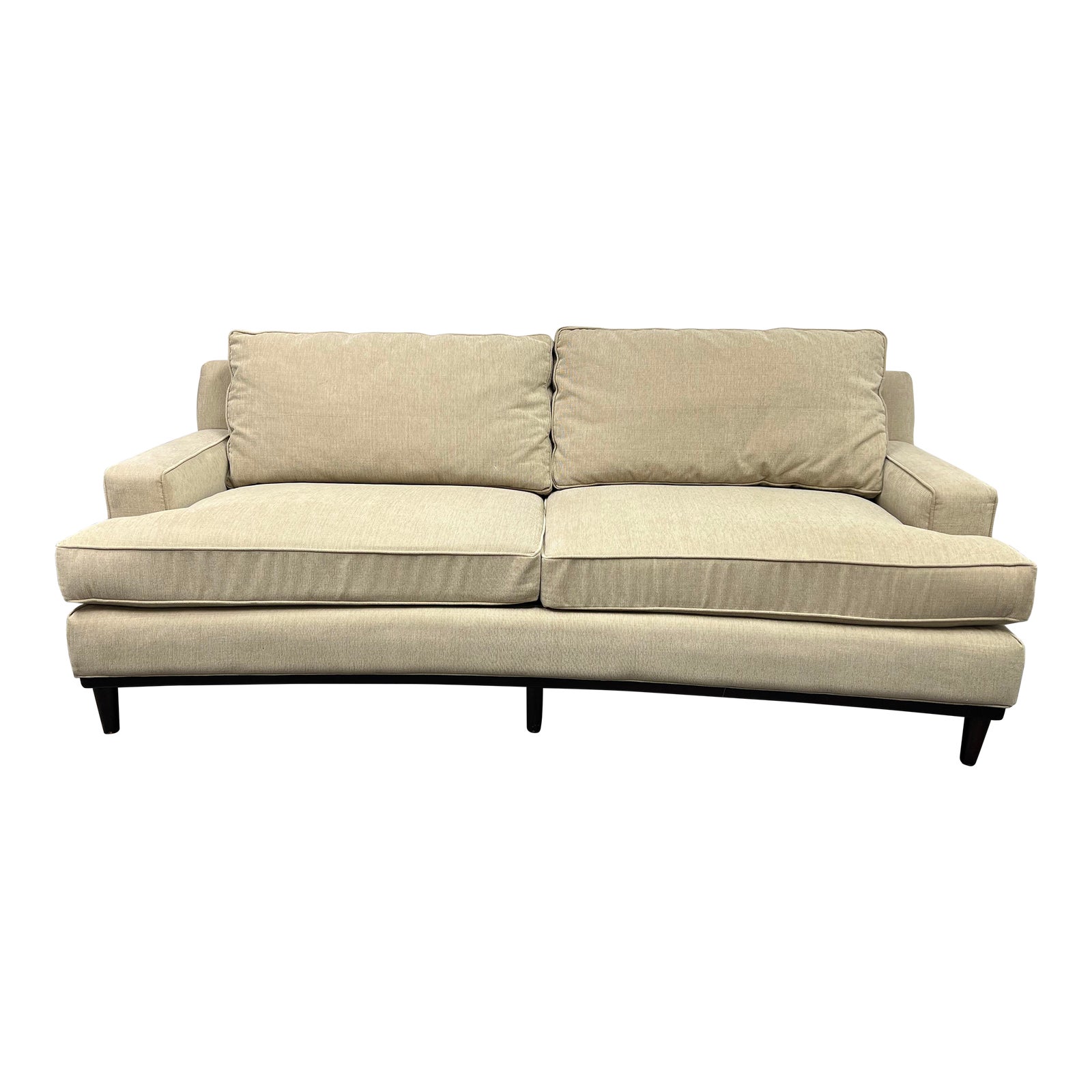 Design Plus Gallery presents a Room & Board Ivory Micro Fiber Sofa. Elegant base is comprised of satin black sold wood which wraps around the entire footprint with tapered legs. T-cup seat cushions are tailored around the low and and wide arms. Angled back gives good support for hours of relaxation. Neutral micro fiber fabric is easy to maintain and blend with existing schemes. Minor wear through out, sofa is in good condition.