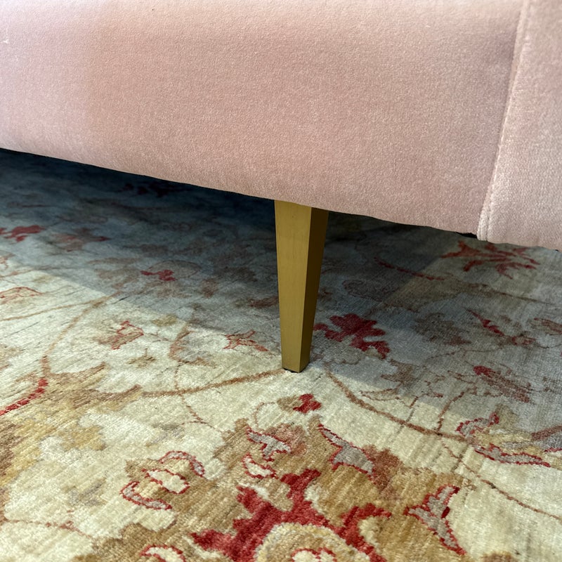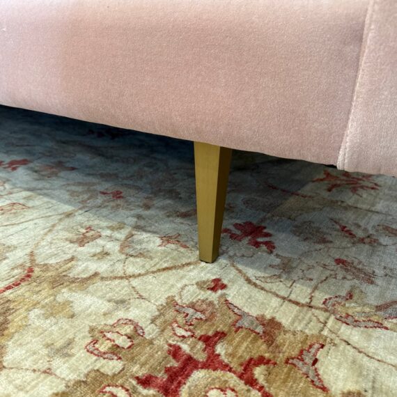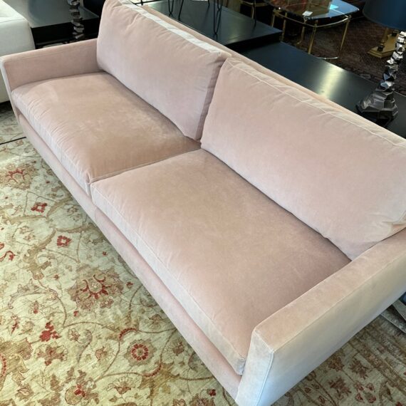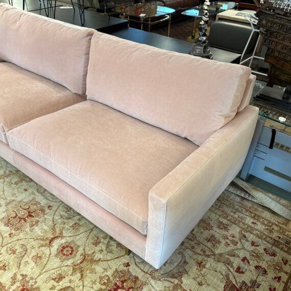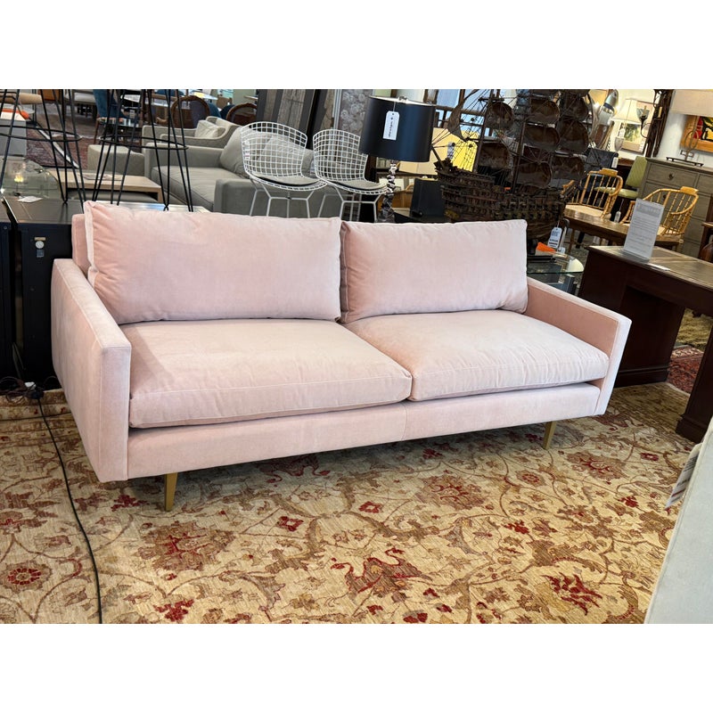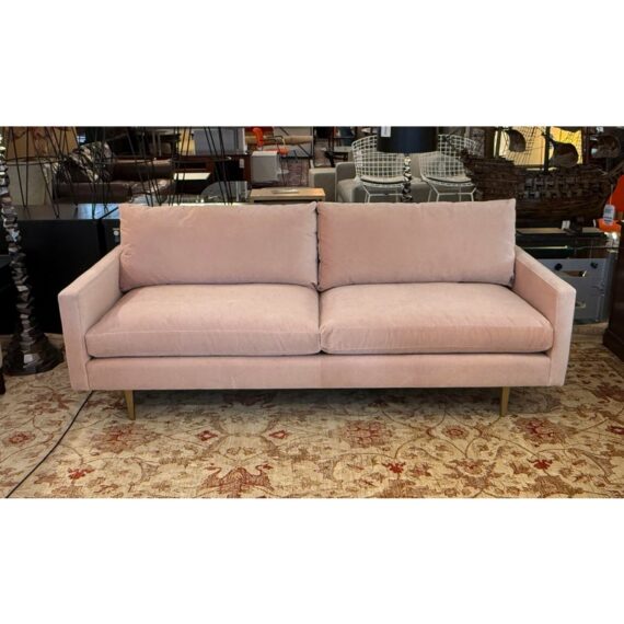 Design Plus Gallery presents the Jasper Sofa from Room & Board. Mid-century styling meets modern comfort in this Rose velvet Jasper sofa. Narrow arms make the most of the seating space, while elegant legs in brass tone give Jasper a light profile. Plush, blend-down cushions envelop you in comfort and the smaller-scale frame won’t overwhelm your space. The color and fabric are no longer in production and it is in good overall condition for its usage. Made in the USA.