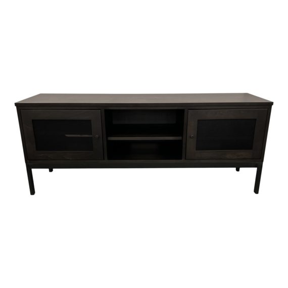 Design Plus Gallery presents the Room & Board Linear Two-Door Media Cabinet. Constructed with maple wood and given a charcoal stain. Comes with three adjustable wood shelves. The doors have a soft-close, open up to 110 degrees, and feature adjustable hinges. The base is made with 99% recycled natural steel. Wear is consistent with use; media cabinet is in good condition. Made in Wisconsin, USA.