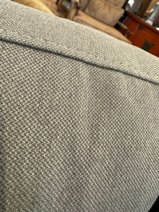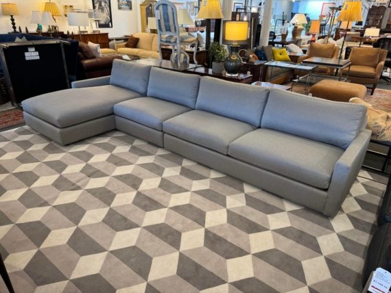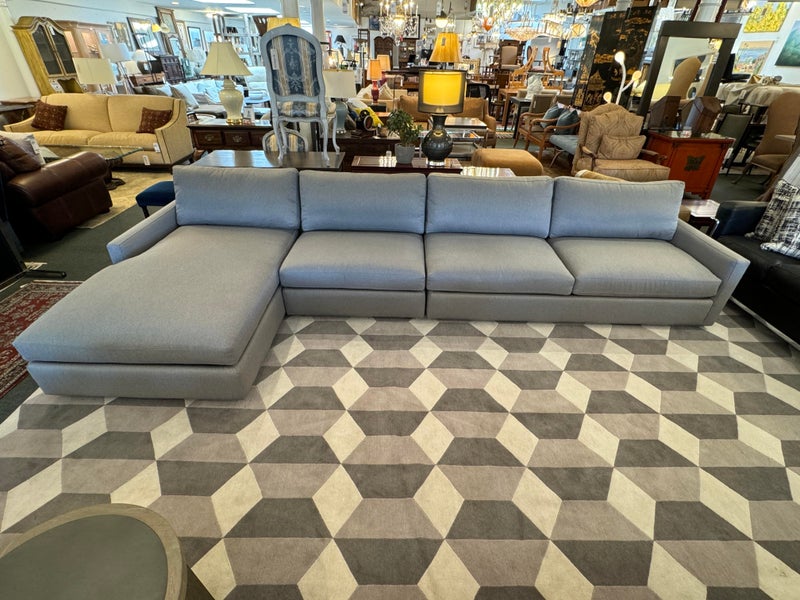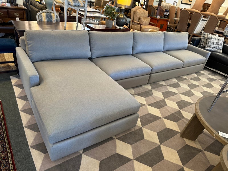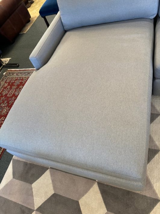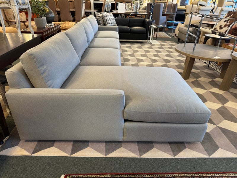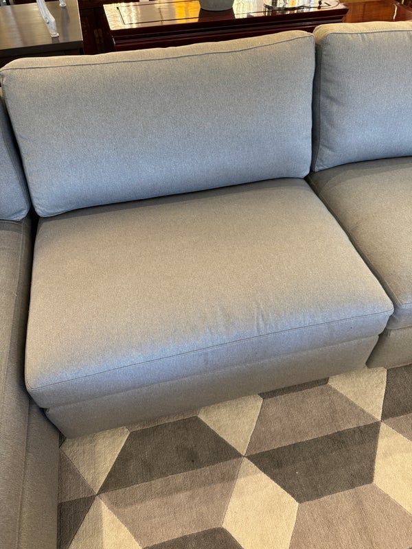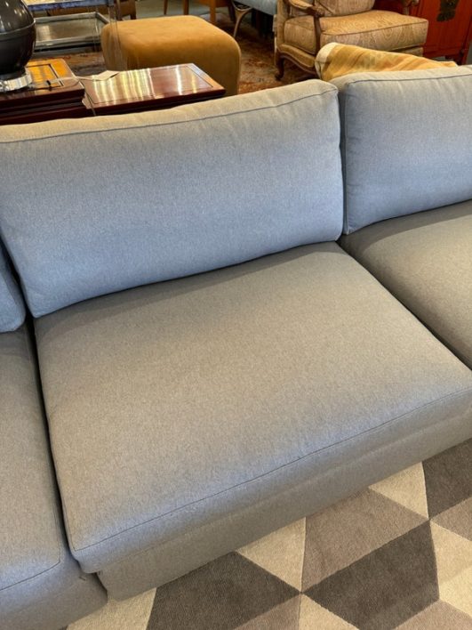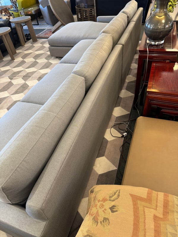 Design Plus Gallery presents a Light Gray Sofa with Connected Slipper Chair + Chaise Lounger from Room & Board. Fabric is known as the Dawson and offers the exceptional performance with the durability of a micro-fiber minus the suede-like texture. A small zig-zag pattern gives visual interest to this soft, stain-resistant fabric. The sofa has three back and seat cushions with the chaise having a long cushion with back cushion and track arms. Is in good condition with minimal signs of noticeable wear and removable upholstery to the loose cushions make this an easy to clean addition to your home, office, or game room. Made in USA.