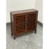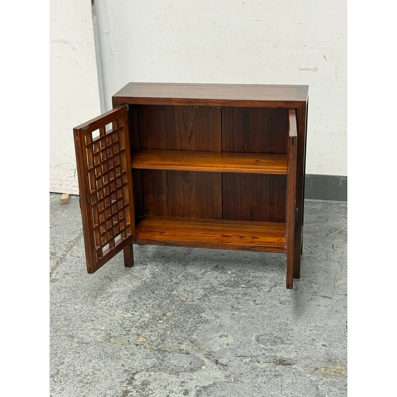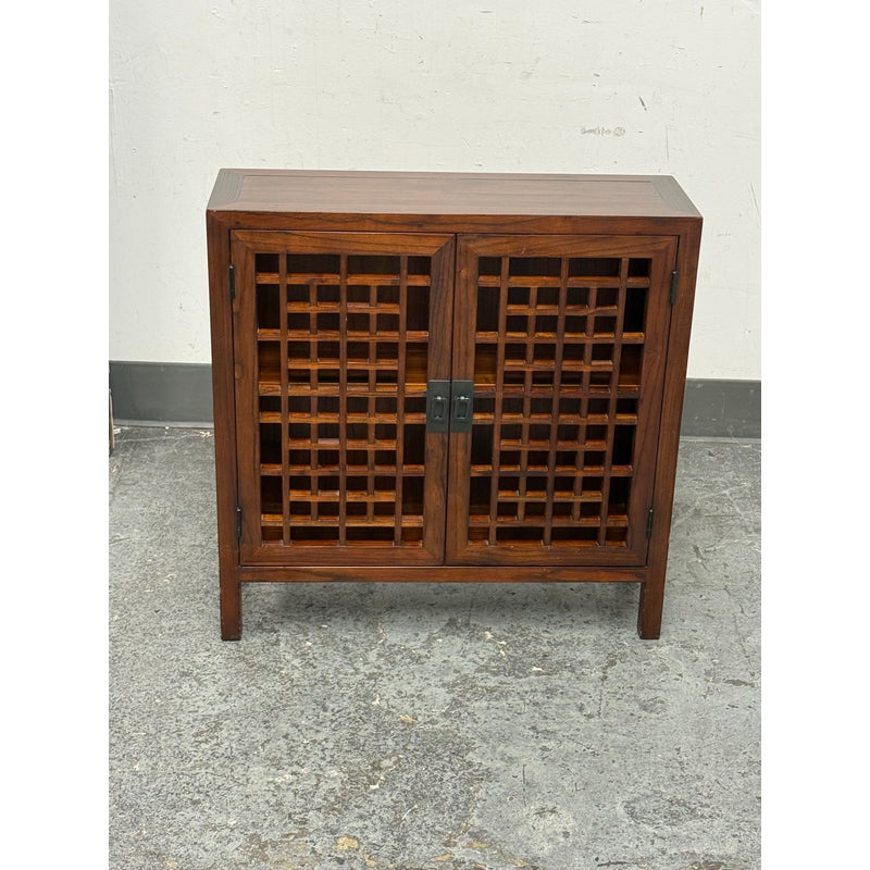 Design Plus Gallery presents the Taipei Cabinet by Maria Yee for Room & Board. This compact wood cabinet is constructed with a rectangular case on square legs and fitted with two hinged doors detailed with an open grid pattern. Matte black hinges and center pulls secure the doors, opening to a two-level interior with a fixed shelf for organized storage. This is a discontinued model with the brand and is in good condition with visible and minimal wear from usage. Designed in California and crafted in China.