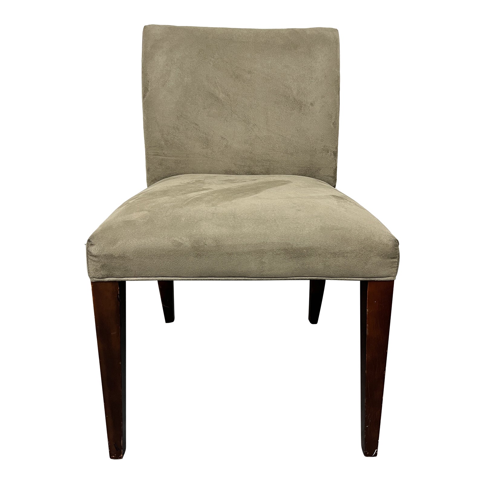 Design Plus Gallery presents a Marie Side Chair by Room & Board. The legs are constructed with wood; the back legs have cabriole curves, and the front are square with a taper. The upholstery is in greige. The back is slightly curved back. Welting accentuates the back and the seat’s bottom perimeter. There is wear on the wood. Minor wear from use; chair is in good condition.