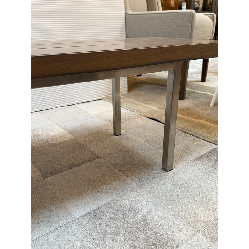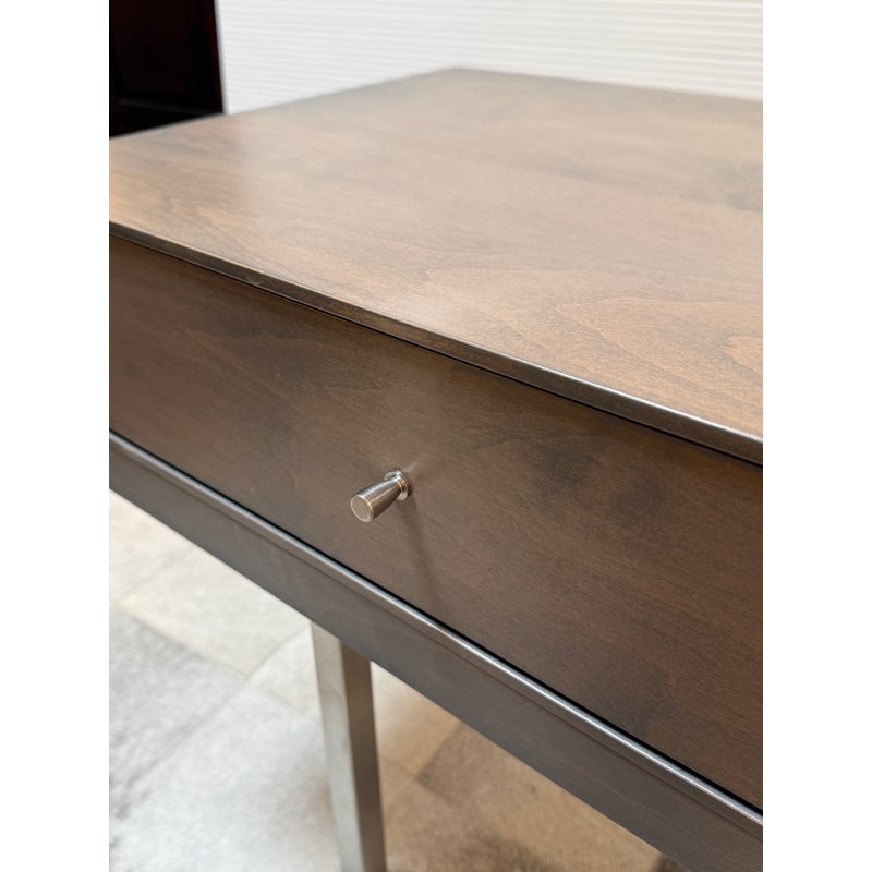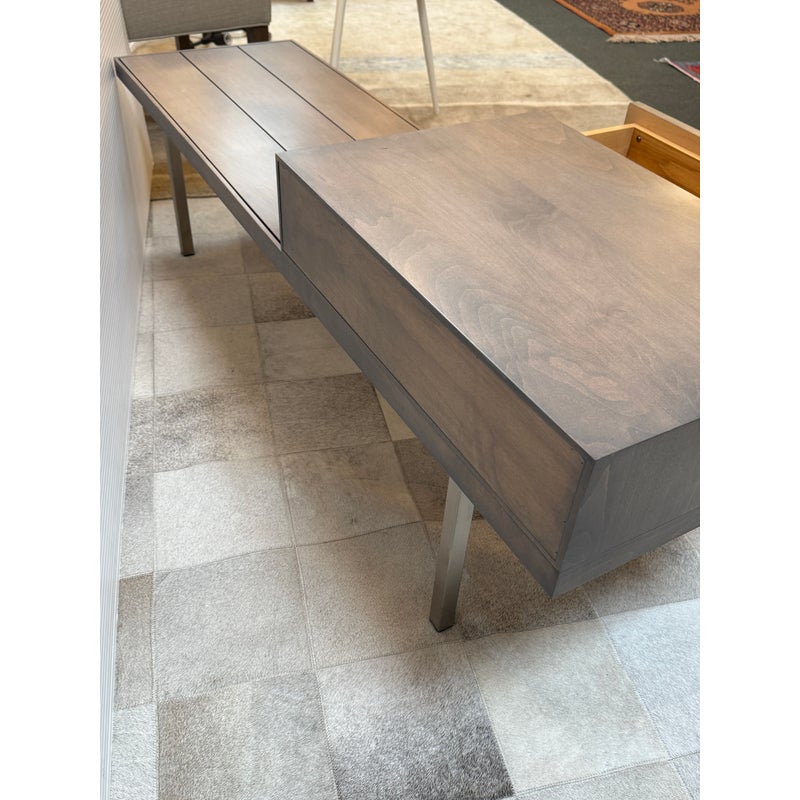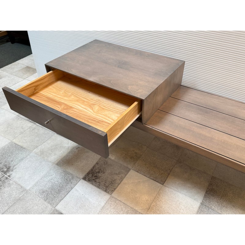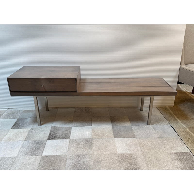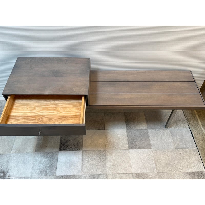 Design Plus Gallery presents the Morris Bench Seat with Drawer from Room & Board. Beautiful and functional, the Morris bench is handcrafted by artisans to serve you well in any room. The sleek design features a fixed drawer on the left side, perfect for gloves in the entryway or remotes in your living room. Made from maple wood with charcoal stain to blend into any new build with no issue. The bench is no longer in production with the brand and is in good condition or its usage. Made in USA.