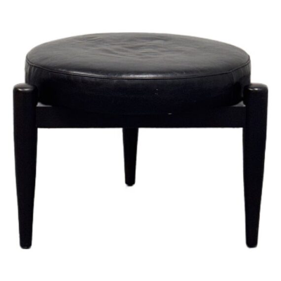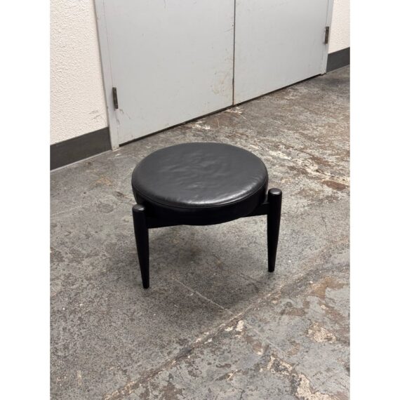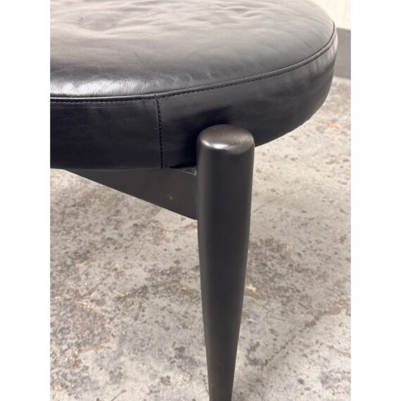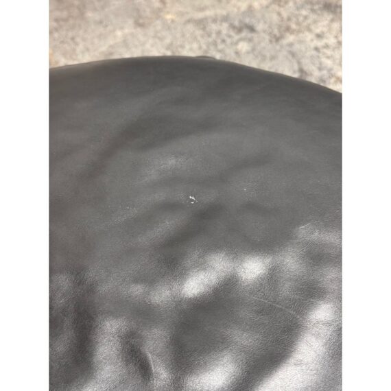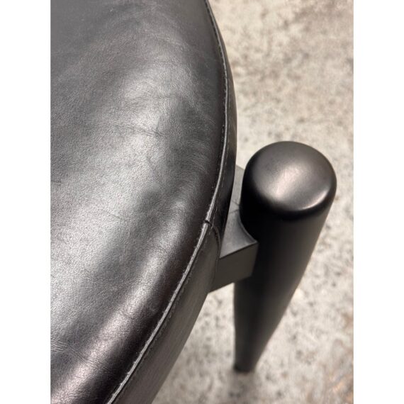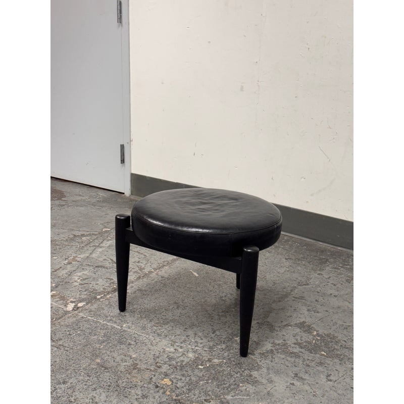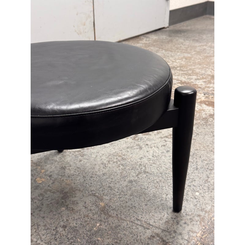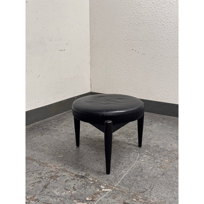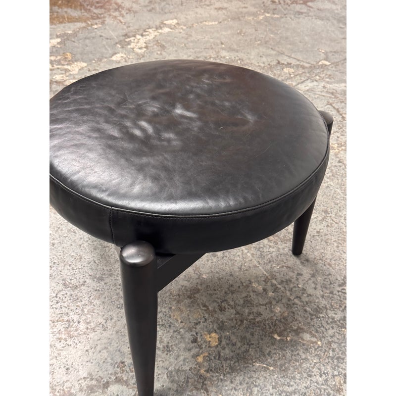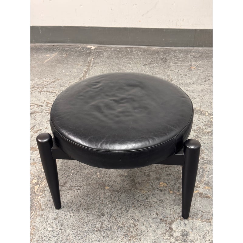 Design Plus Gallery presents the Murphy Leather Ottoman from Room & Board. This ottoman showcases a rounded leather cushion supported by a sculpted solid wood base. Its compact footprint functions equally as a footrest or as extra seating, when needed. The clean lines and rounded form give it a versatile look that pairs seamlessly with a range of interiors, from modern to transitional spaces. In good condition, visible and minimal wear from usage. Made in USA.