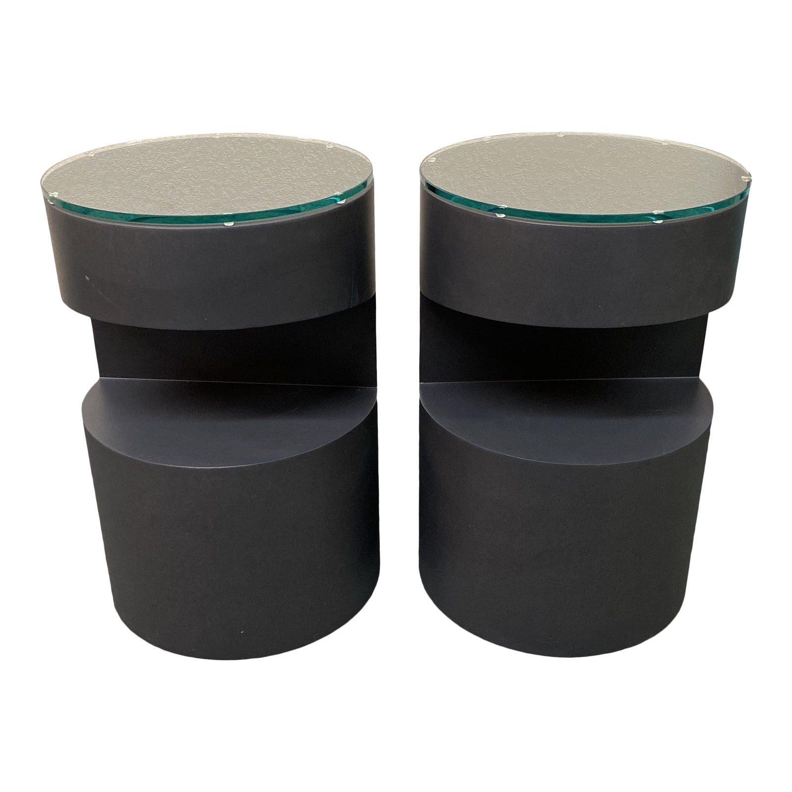 Design Plus Gallery presents a pair of Crate & Barrel Side Tables. Natural steel cylinders with cutouts for a shelf, are topped with removable glass rounds for surface protection. Contemporary silhouette and compact scale allows the pair to work as end tables or nightstands.