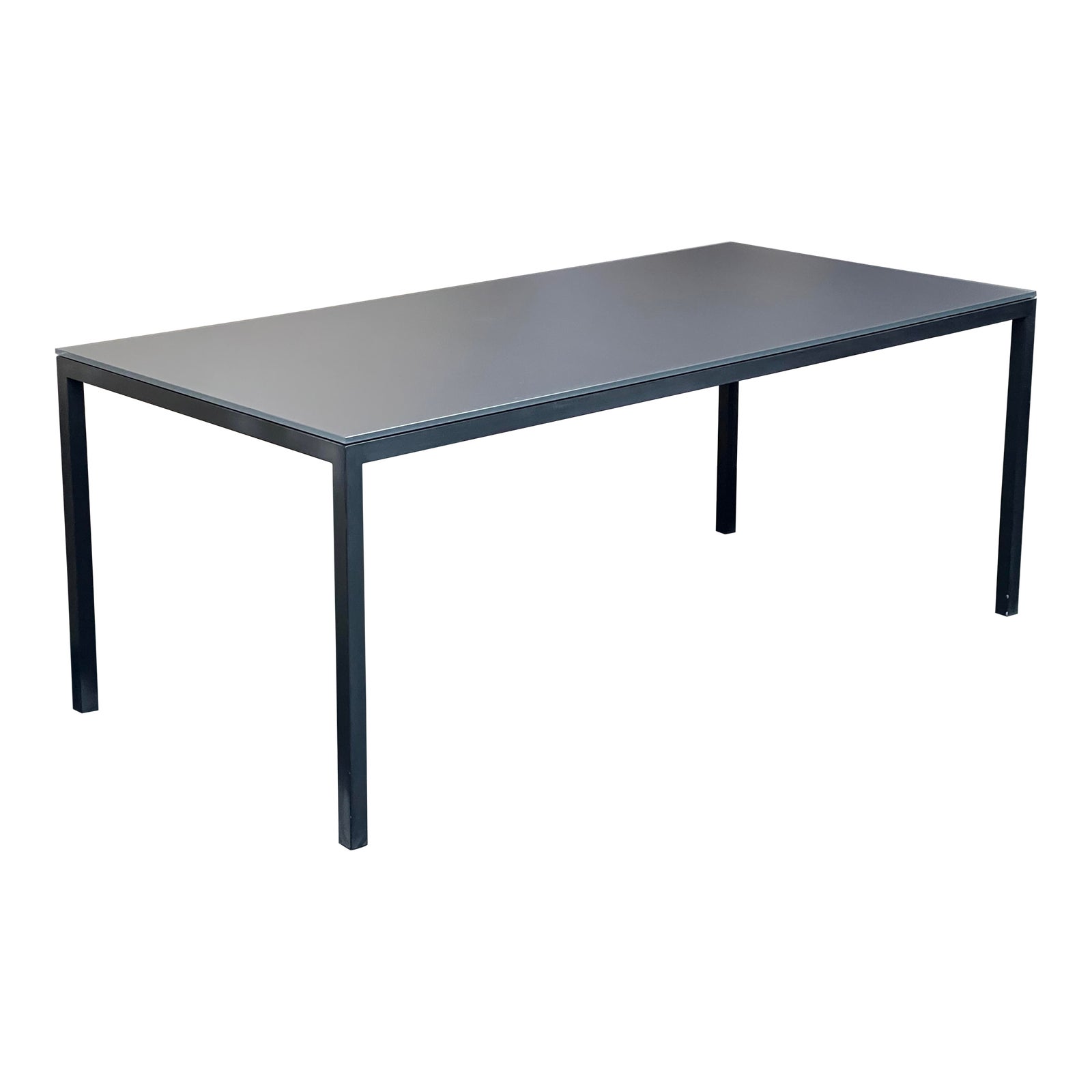 Design Plus Gallery presents a Room & Board Outdoor Parsons Smoked Glass + Graphite Base Dining Table. Hand-welded frame is anchored with plastic foot caps. Tempered glass is smoked in a tonal fashion with the graphite base for a striking modern look. The parsons silhouette continues the vibe with a timeless design. Table is nice enough to use indoors as well. Base is welded with stainless steel. Minor wear on surfaces, Finished are durable and weather resistant. There is one small scratch on the smoked coat. Bases are made in Wisconsin.