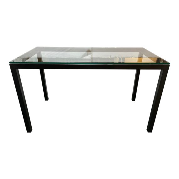 Design Plus Gallery presents a Room & Board Parsons Bar Height Table. Simple and modern, Parson’s silhouette blends effortlessly with almost any style. Metal silhouette is powder coated a black matte finish and is paired with a clear glass top. This table’s sleek corner-set legs will allow you to maximize seating. Wear is consistent with use; item is in good condition. Made in Minnesota, USA.