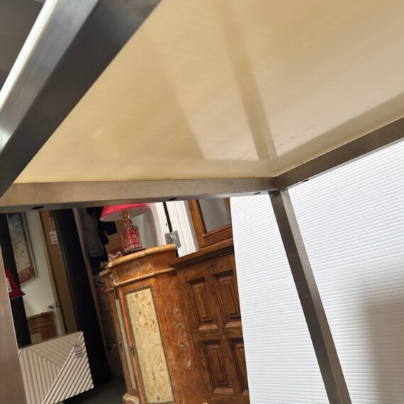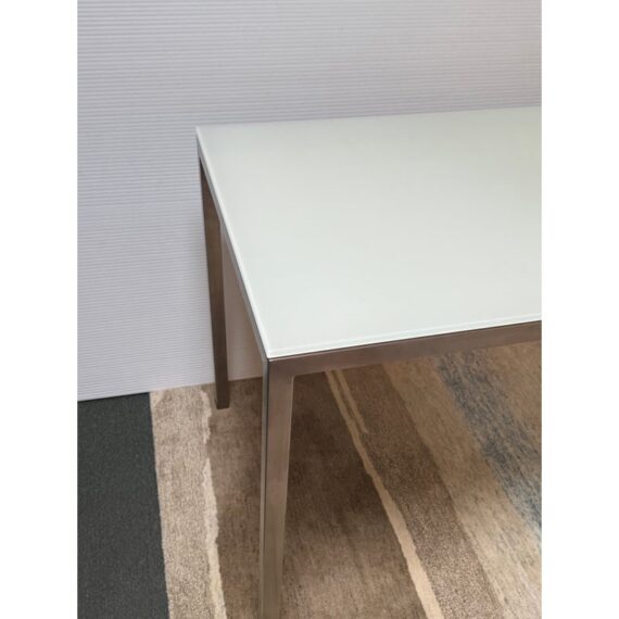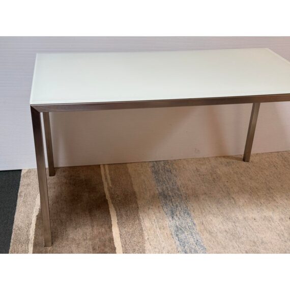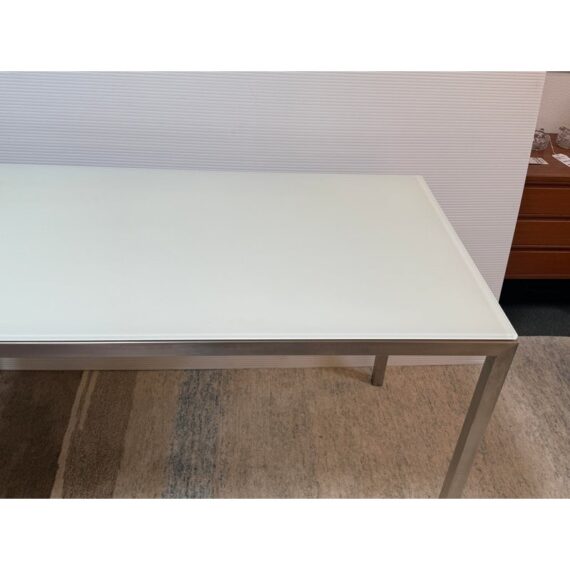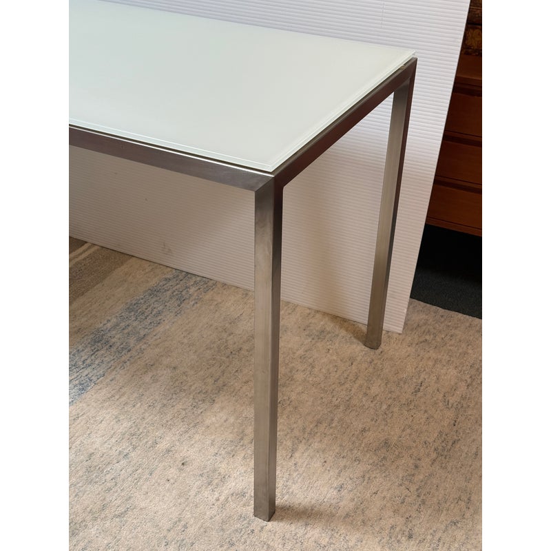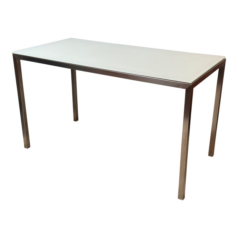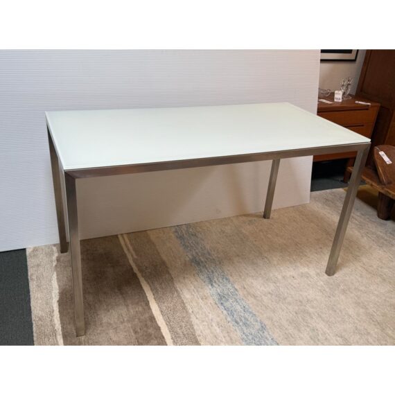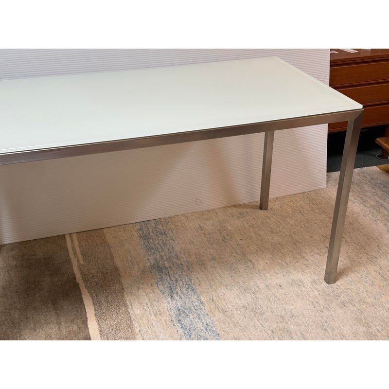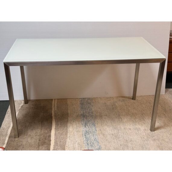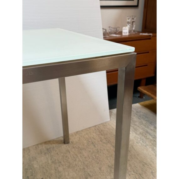 Design Plus Gallery presents the Room & Board Parsons Counter Height Table by Room & Board. Featuring a recycled natural steel frame that’s hand-welded and anchored with plastic foot caps. The rectangle tabletop is topped with satin etched glass for a classic contemporary look. The Parsons silhouette is a timeless staple of modern design. Little wear; condition is good.