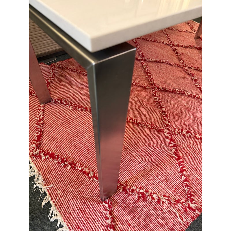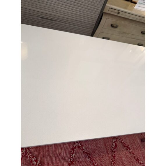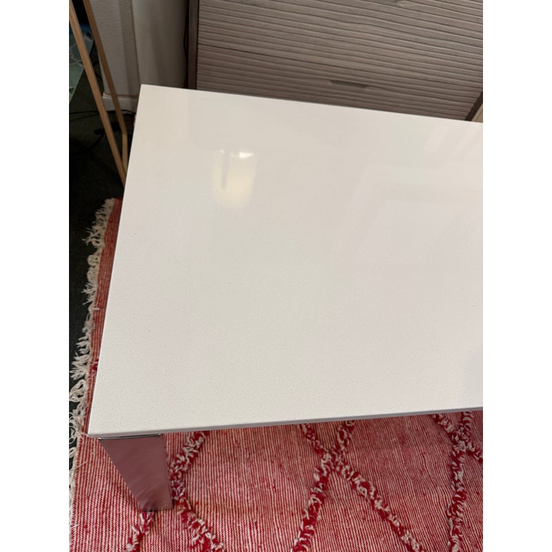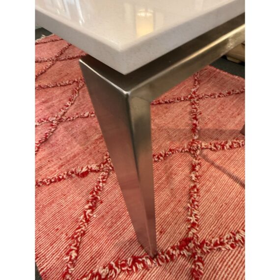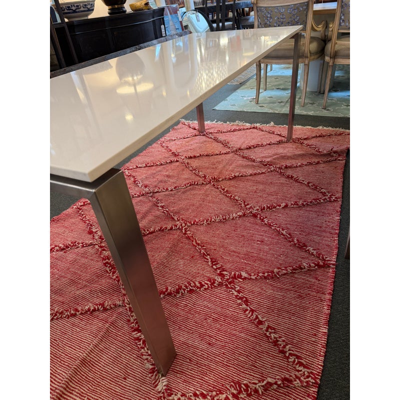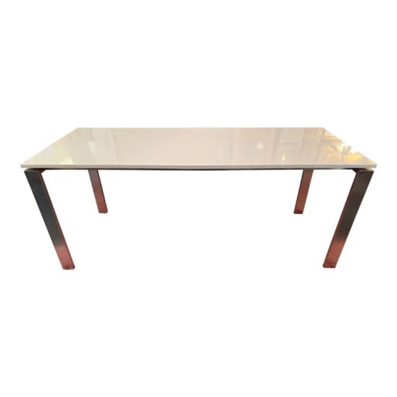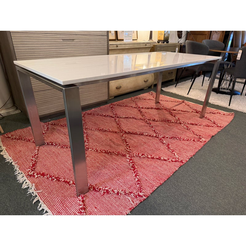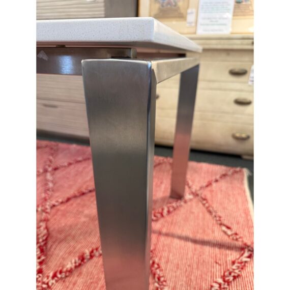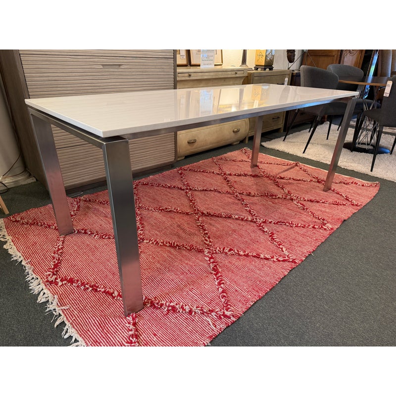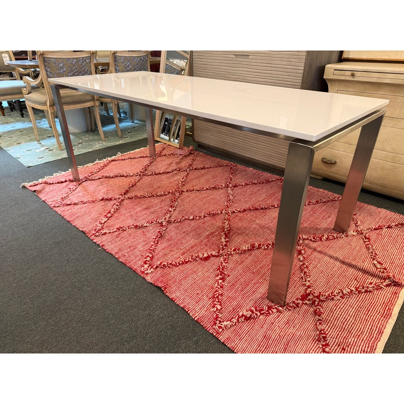Design Plus Gallery presents the Rand Dining Table from Room & Board. The table is scaled to work like a slim dining table or as a long desk. There is a simple top that seems to float above the metal base. This surface is nice + crisp of solid surface quartz and its frame is of brushed stainless steel table, all having clean elegant lines the Parson’s style is known for. Light surface wear; condition is good for age and use.
