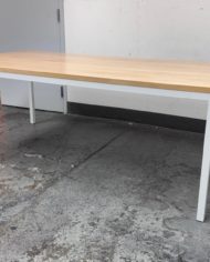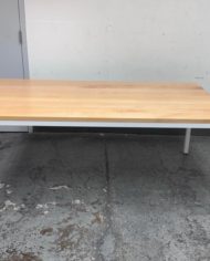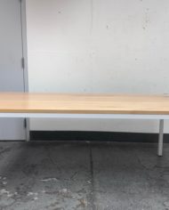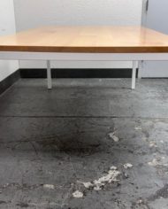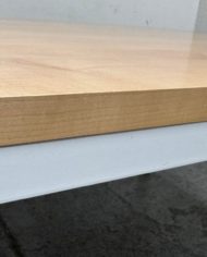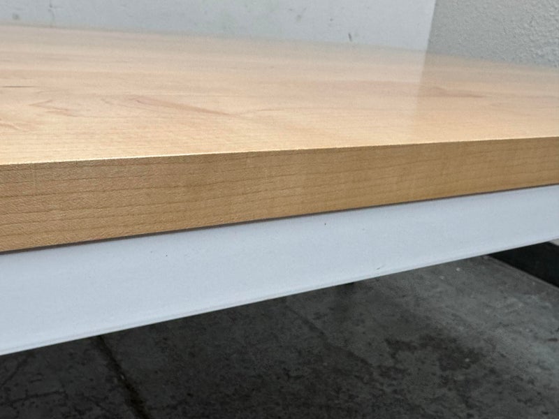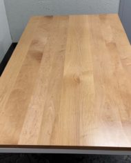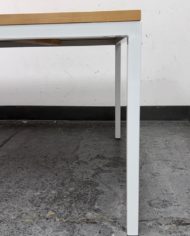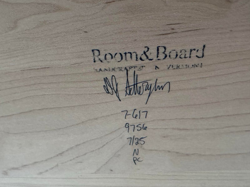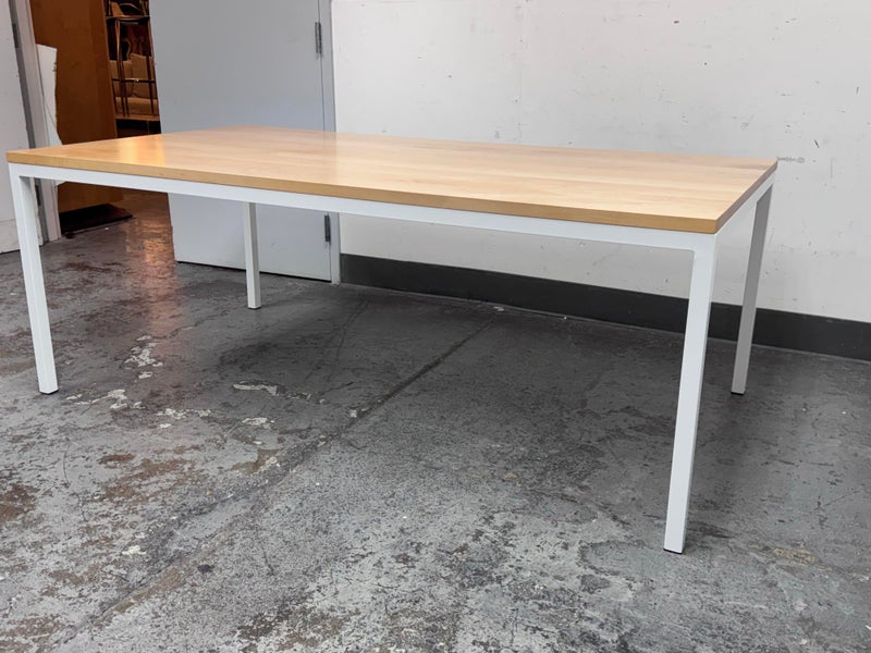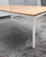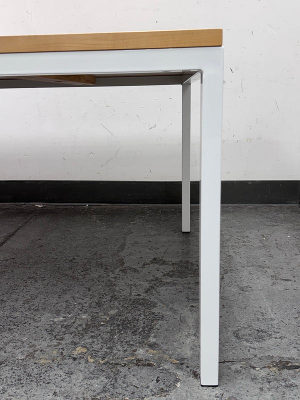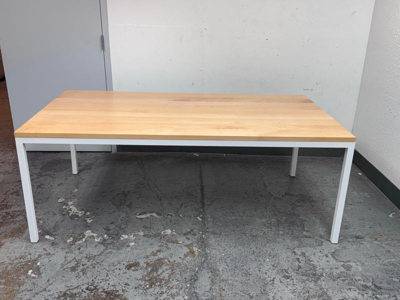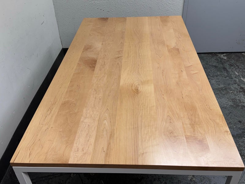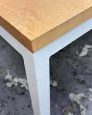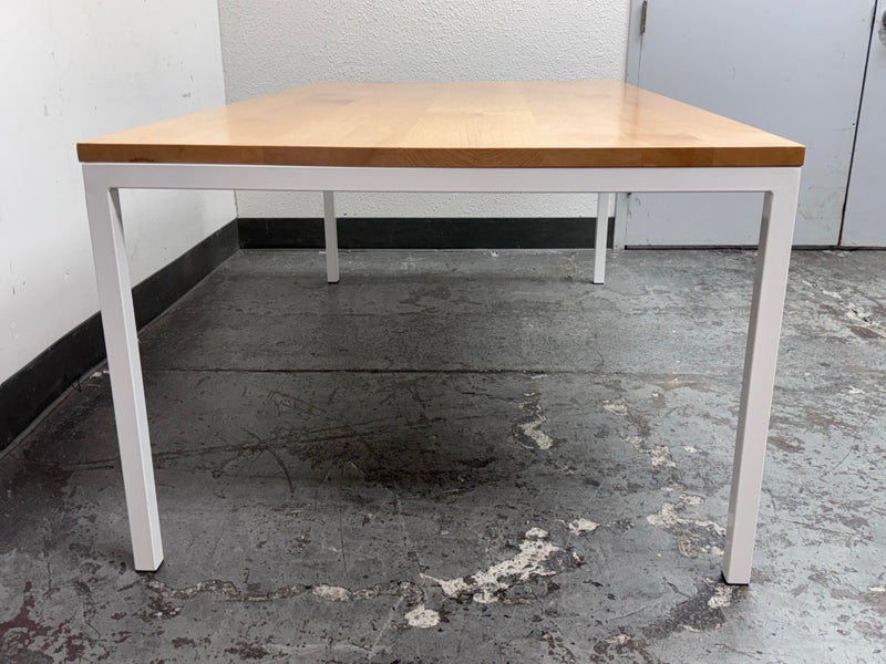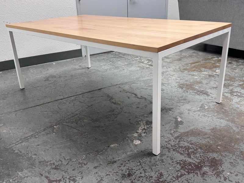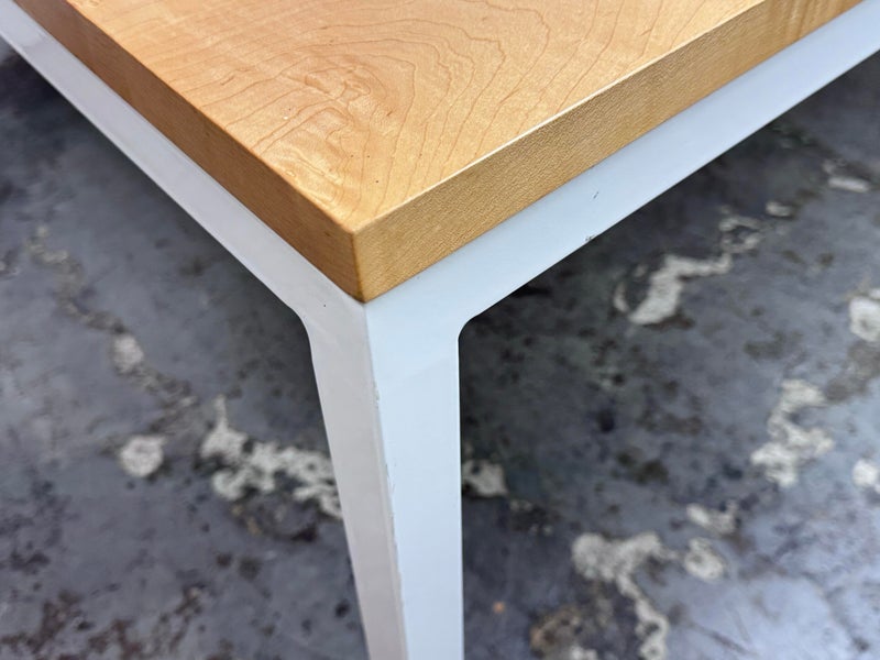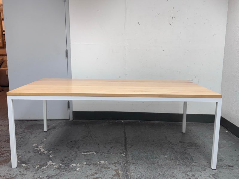 Design Plus Gallery presents a Parsons Dining Table by Room & Board. The table top is a Maple Wood Surface. The hot-rolled tubular steel frame is powered coated in stark white with traditional Parsons-style to support the wood top while keeping clean simple lines. Corners are hand-welded for a raw, torched finish. Easily seating 6, the casual table is perfect for everyday dining or entertaining. In good condition, visible and minor wear. Made in USA.